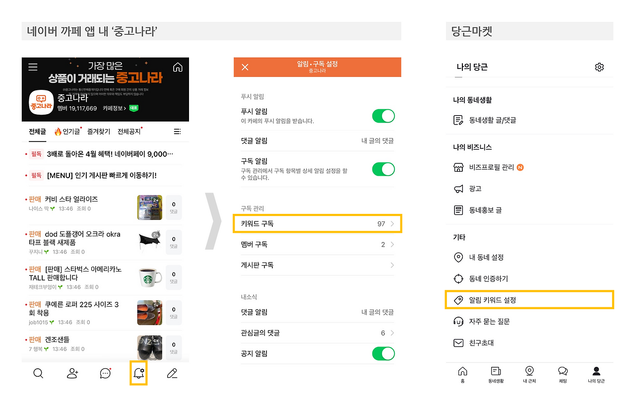 키워드를 등록하는 방법은 간단하다. 중고 나라 앱에서는 하단의 종 모양을 누르면, '키워드 구독, 멤버 구독'이 가능하다. 키워드 구독에 관심 있는 키워드를 100개까지 등록할 수 있고, 내 취향의 육아 용품, 책을 자주 올리는 판매자를 구독할 수도 있다. 중고 거래를 처음 하기 시작한 곳이 중고 나라이다 보니, 중고 나라 키워드 설정은 처음에 어디에 있는지 찾기가 상대적으로 좀 어려웠던 기억이 있다. 당근마켓은 더 쉽다. '나의 당근'에 들어가면 '알림 키워드 설정'이 있다. 최대 30개까지 등록할 수 있다.