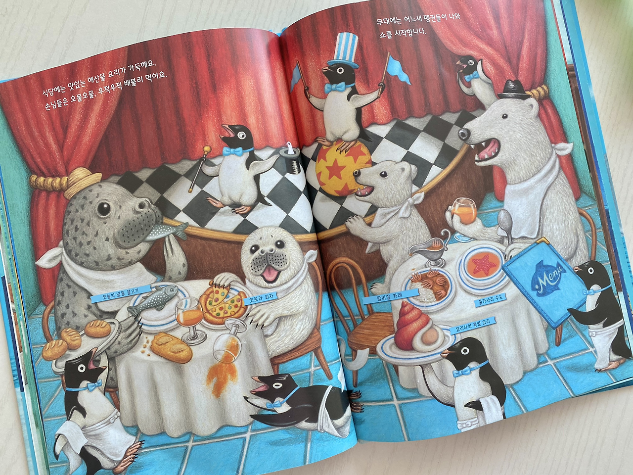 펭귄호텔이라는 책을 읽다 보면 저녁 파티 장면이 나오는데, 그림이 글보다 더 재미있는 내용을 많이 담고 있다. 몇 십 번쯤 읽었을 때 아이와 나는 이 페이지에서 떨어지려는 컵을 발견했다. 아이는 그 이후로 이 페이지를 읽으면 "요 놀이할까?"라고 말하면서 떨어지는 물컵을 가리킨다.