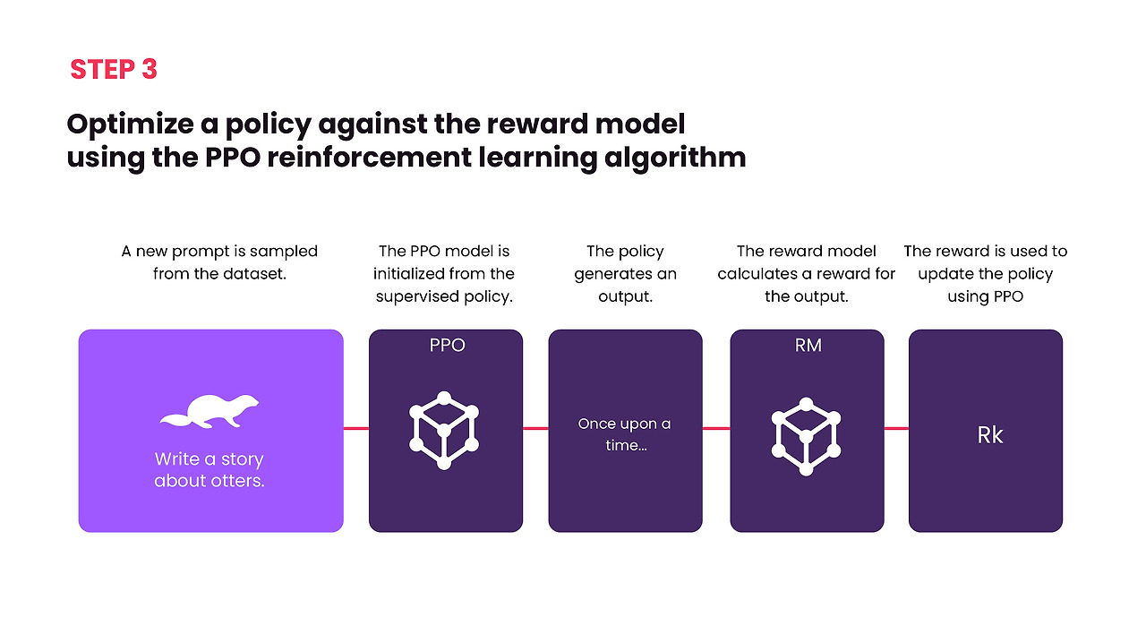 3단계: PPO 강화 학습 알고리즘을 사용하여 보상 모델 정책 최적화