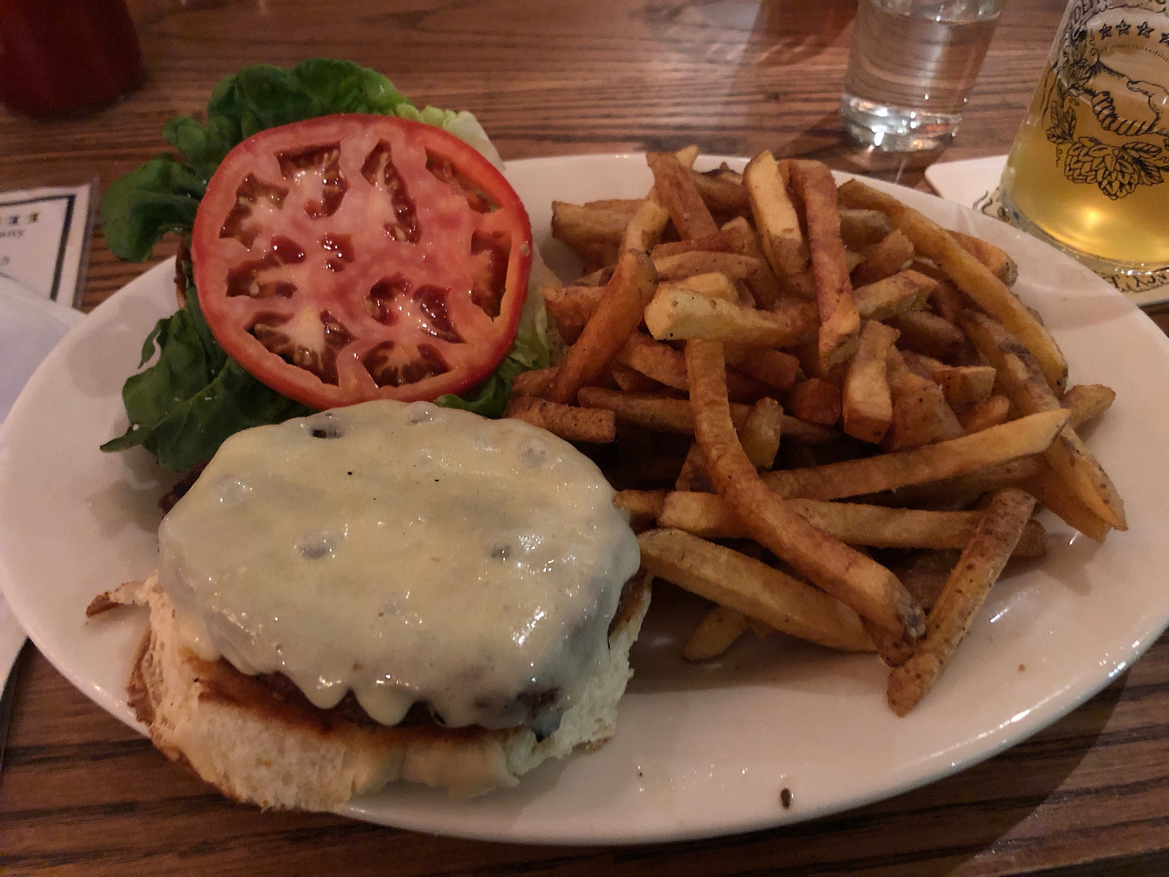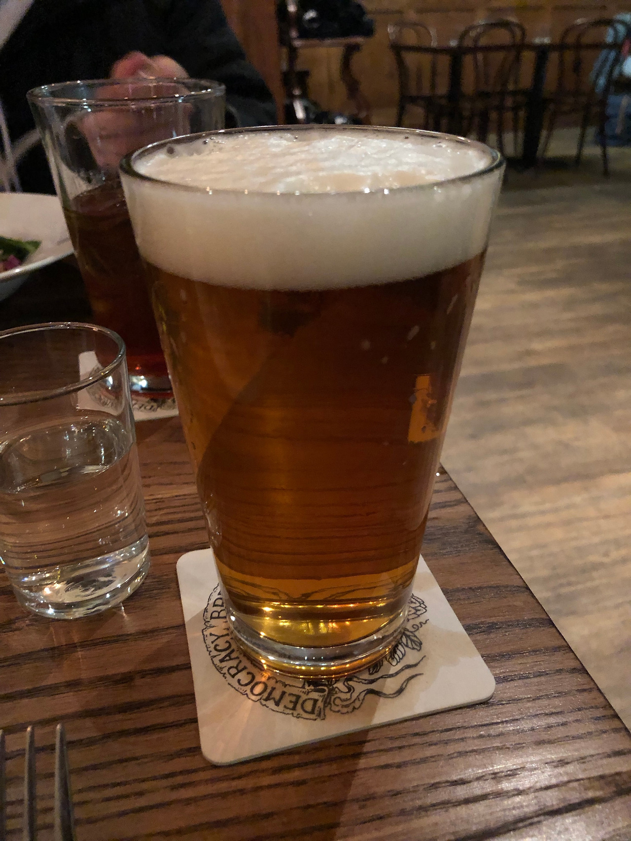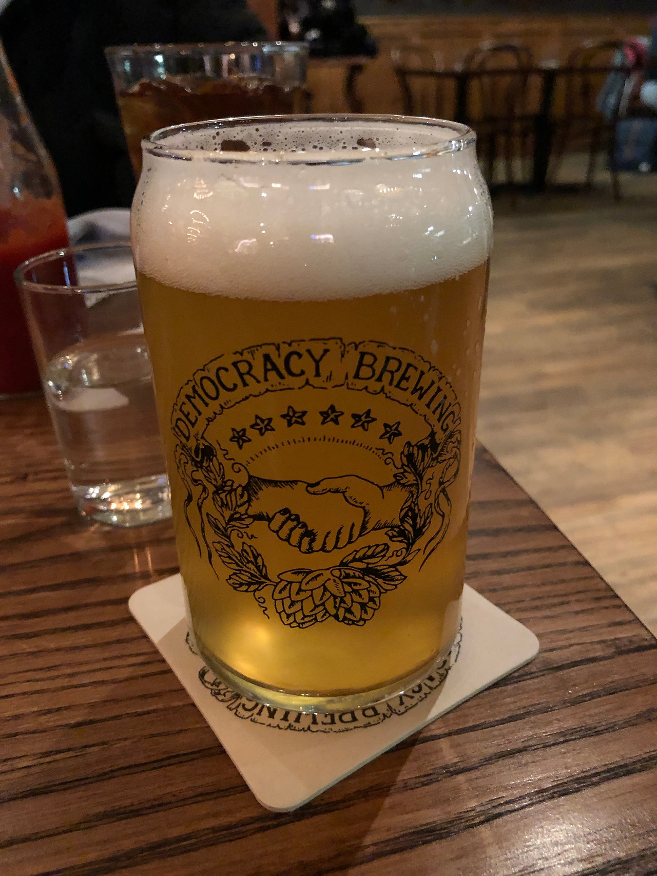 'Democracy Brewing'이라는 이름을 가진 브루어리에 도착하였다. 문을 열고 들어가니 오른편 벽면에 보이는 벽화가 인상적이었다. 도시의 건물들을 배경으로 그리스 여신이 오른손엔 맥주를 위로 들고 왼손에 칼을 아래로 쥐고 있었다. 가게 안은 사람들로 가득 차서 시끌벅적했다. 바 위에 달린 여러 대의 텔레비전에서는 스포츠 경기가 중계중이었는데 역시나 레드삭스 경기도 있었다. 직원의 안내에 따라 큰 테이블의 맨 끝 좌석으로 안내받았다. 수십 명이 한 번에 단체로 앉을 수 있을 만큼 커다란 나무 탁자였다 해리포터 친구(이하 해리)는 최근에 건강검진을 받았는데 기름진 것을 피해야 된다며 샐러드와 과일음료를 주문했다. 그에 반해 나는 건강검진을 받은 지 오래되어 햄버거 세트와 이곳의 대표 맥주인 ‘Worker’s Pint’를 시켰다. 바로 나온 시원한 맥주를 한 모금 들이키니 왠지 하루 종일 고동 노동을 하고 온 뒤의 맥주 한잔의 행복이 느껴지는 것 같았다. 컵은 일반적인 알루미늄 캔음료 형태의 유리컵이었는데 두 손이 서로 맞잡고 있는 그림이 그려져 있었다. 브루어리의 철학과 잘 어울리는 엠블럼인 것 같았다.