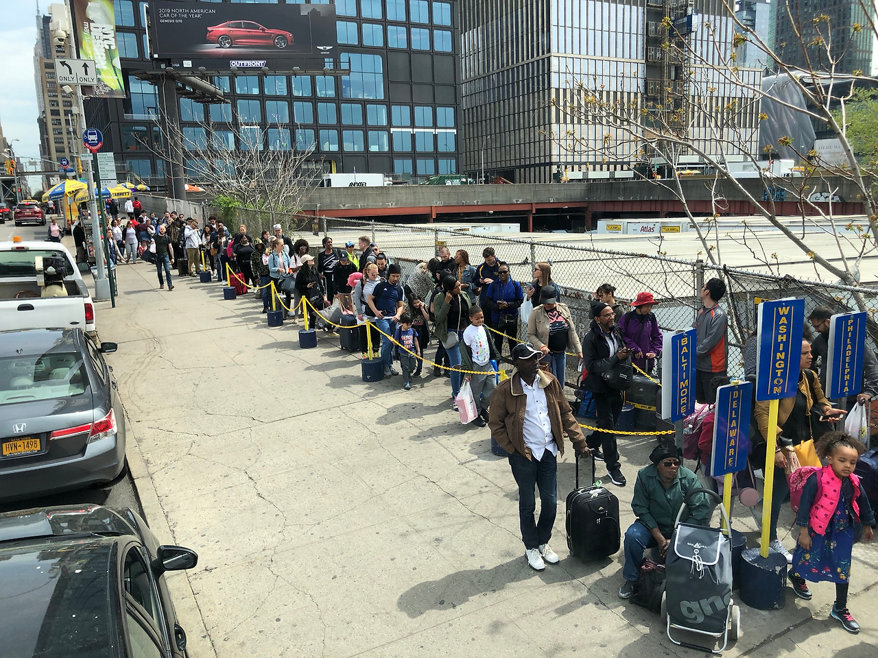 캐리어가 아무리 불편해도 점심은 먹어야 하기에 전에 들렀던 베이글 가게로 향했다. 이번에는 훈제 연어 샌드위치 말고 다른 걸 먹어보고 싶어 고민하다 기본 메뉴 중 하나인 햄 샌드위치를 선택했다. 훈제 연어 샌드위치가 너무 맛있었던지 햄 샌드위치는 평범하게 느껴졌다. 그러나 이곳의 음식은 언제나 가격만큼의 양으로 제공하기에 배부른 점심을 먹을 수 있었다. 점심을 해결하고 버스터미널로 향했다. 걸어서 15분 정도면 갈 수 있는 거리로 허드슨 야드 옆에 위치하고 있었다. 목적지 주위에 다다랐는데 전에 다녀간 허드슨 야드의 명소와는 다른 분위기였다. 공사 중인 건물들이 많아서 어수선하고 각종 차량과 장비들이 오가느라 번잡하였다. 그때 이상한 느낌이 들었고 언제나 그런 슬픈 예감은 틀린 적이 없다. 횡단보도를 건너니 멀리 길가에 2층 버스들이 줄지어 서있는 것이 보였다. 내가 생각하던 터미널과는 다른 모습이었다. 사실 터미널이 아니라 정류장이었다. 콘크리트 밑동에 쇠파이프가 꽂힌 표지판에는 각각의 도시 이름이 적혀 있었고 그 뒤로 가이드라인을 따라 사람들이 자신의 목적지에 맞게 서있었다. 내가 탈 버스의 출발시간은 오후 1시 40분 버스인데 아직 1시도 되지 않아 시간의 여유가 있었다. 잠시 화장실도 다녀올 겸 허드슨 야드의 한 쇼핑몰로 들어갔다. 내부는 넓고 층고도 높았다. 1층부터 3층까지 건물 중앙부가 뚫려있어 쾌적한 느낌을 주었다. 2층 화장실을 쓰고 나오다 한편에 있는 블루보틀이 눈에 들어왔다. 순간 커피의 유혹에 넘어갈 뻔하다 얼른 에스컬레이터를 타고 내려갔다. 고소한 커피 향이 자꾸 나를 붙잡는 것 같았다.