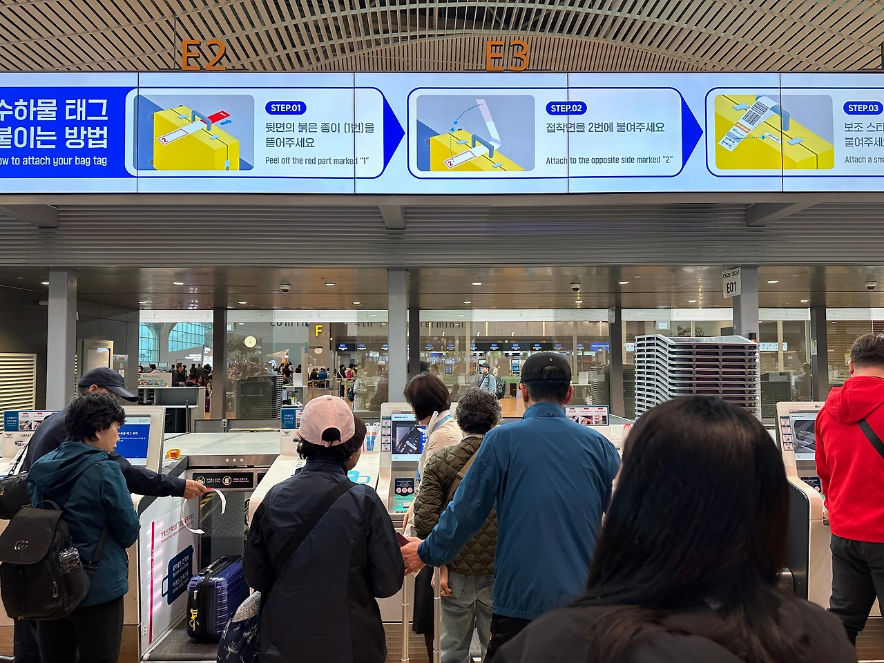 일단 짐을 부치는 게 모두 무인화되어 있더군요. 노인들이 특히 힘들어하는데 저도 막상 손잡이에 붙이는 스티커를 잘못 붙여서 직원이 도와주셨습니다.