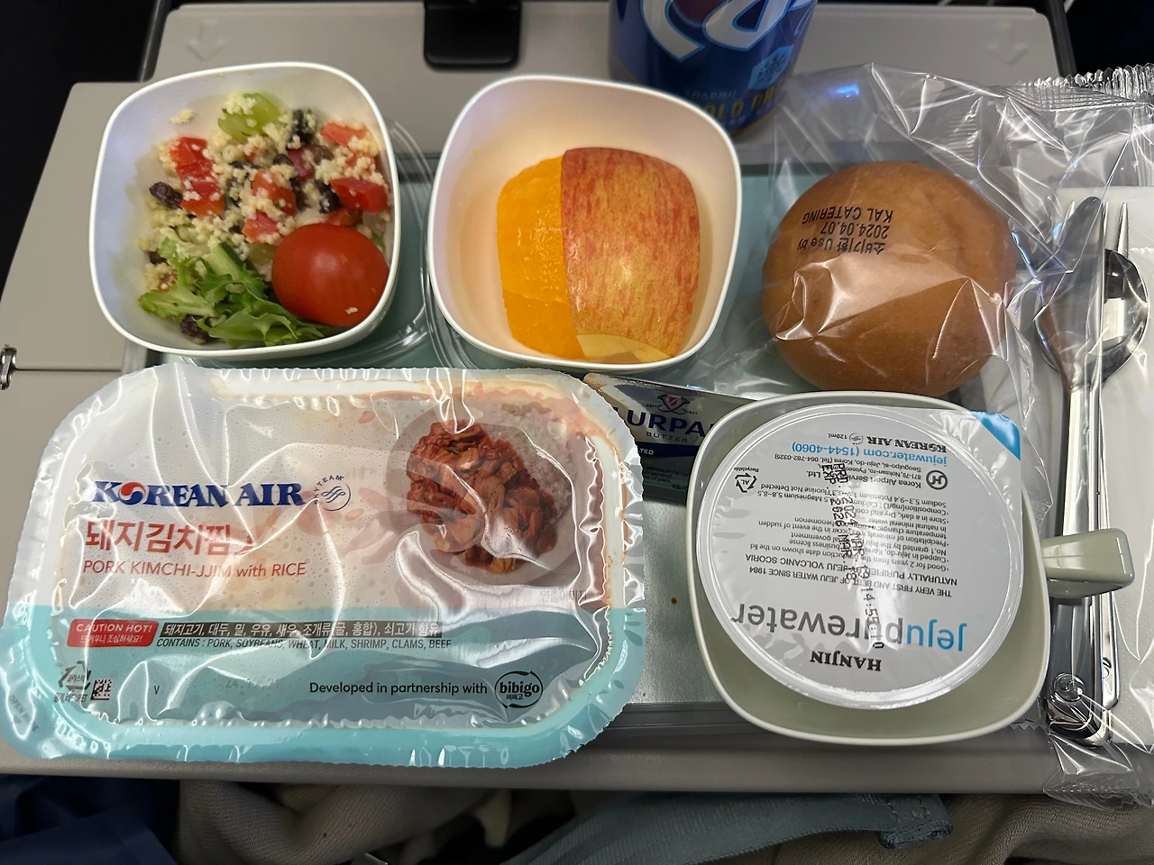 기내식을 총 3번 먹는 기나 긴 비행을 시작했습니다. 예전에 인기 있던 비빔밥은 없어졌는지 첫 끼는 낙지덮밥, 두 번째는 간단히 샌드위치를 줬는데 다 먹고 옆에서 신라면을 먹는 냄새 때문에 결국 또 먹었습니다.