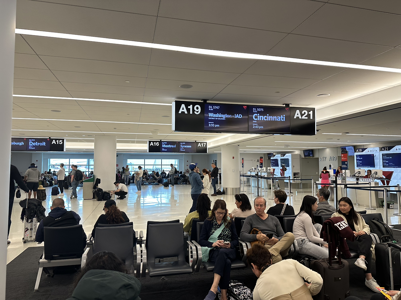 입국수속이 끝나면 짐을 찾고 세관검사 후 나가서 워싱턴 DC로 가기 위해 환승을 해야 합니다. 예약할 때 대한항공 제휴사인 델타항공편을 예약했고 종이티켓 발권 없이 모바일 티켓만 있으면 되니 편리합니다. 수하물은 무조건 찾아서 다시 부쳐야 하는데 다행히 나오자마자 대한항공 카운터가 있어 손쉽게 수하물을 부쳤습니다.