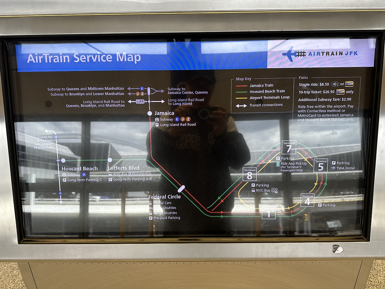 도착 터미널이 1번인데 워싱턴 가는 터미널은 4번입니다. 4층으로 올라가 Air Train을 타면 됩니다. 8년 전엔 사진의 왼쪽 순환선을 탔다가 반대로 돌았는데 이번엔 오른쪽 Jamaica line을 타고 바로 갔습니다.