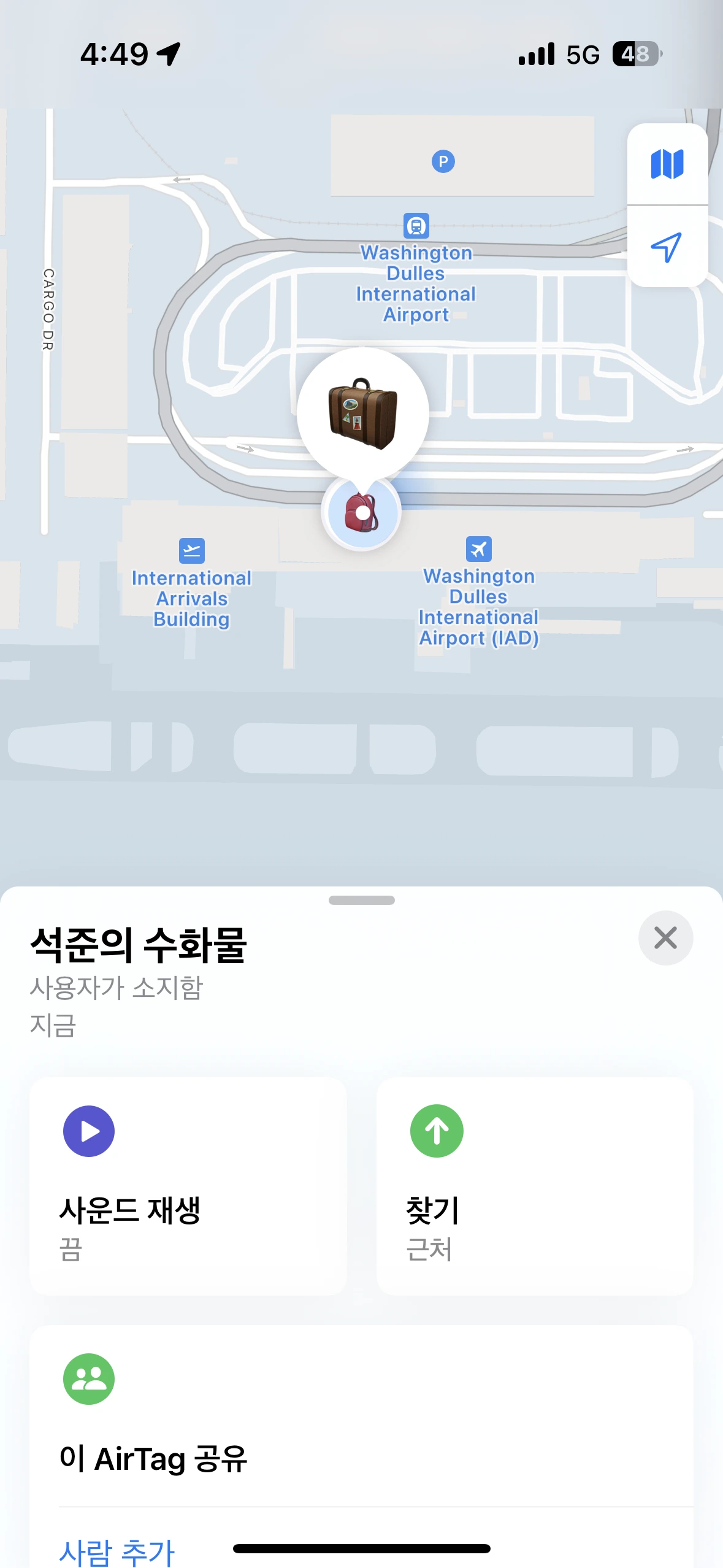 로밍을 위해 전원을 껐다 켜니 위성전화로 구조신호를 보낼 수 있다고 하고 "나의 찾기(Find me)" 앱에서 지도상에 제 애플 기기들을 표사해 줍니다. 수하물에 넣어둔 에어태그가 바로 떠서 금방 찾는데 도움이 됐습니다.