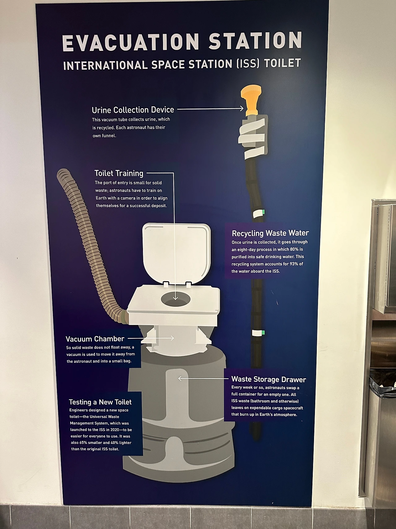 화장실에 들어가니 벽에 우주선에서 배설물 처리 시스템에 대한 그림과 설명이 있었습니다. 우주는 무중력 공간이라 배설물이 허공으로 날리지 않도록 진공청소기 같은 걸로 빨아들입니다. 화장실에 딱 맞는 전시죠.