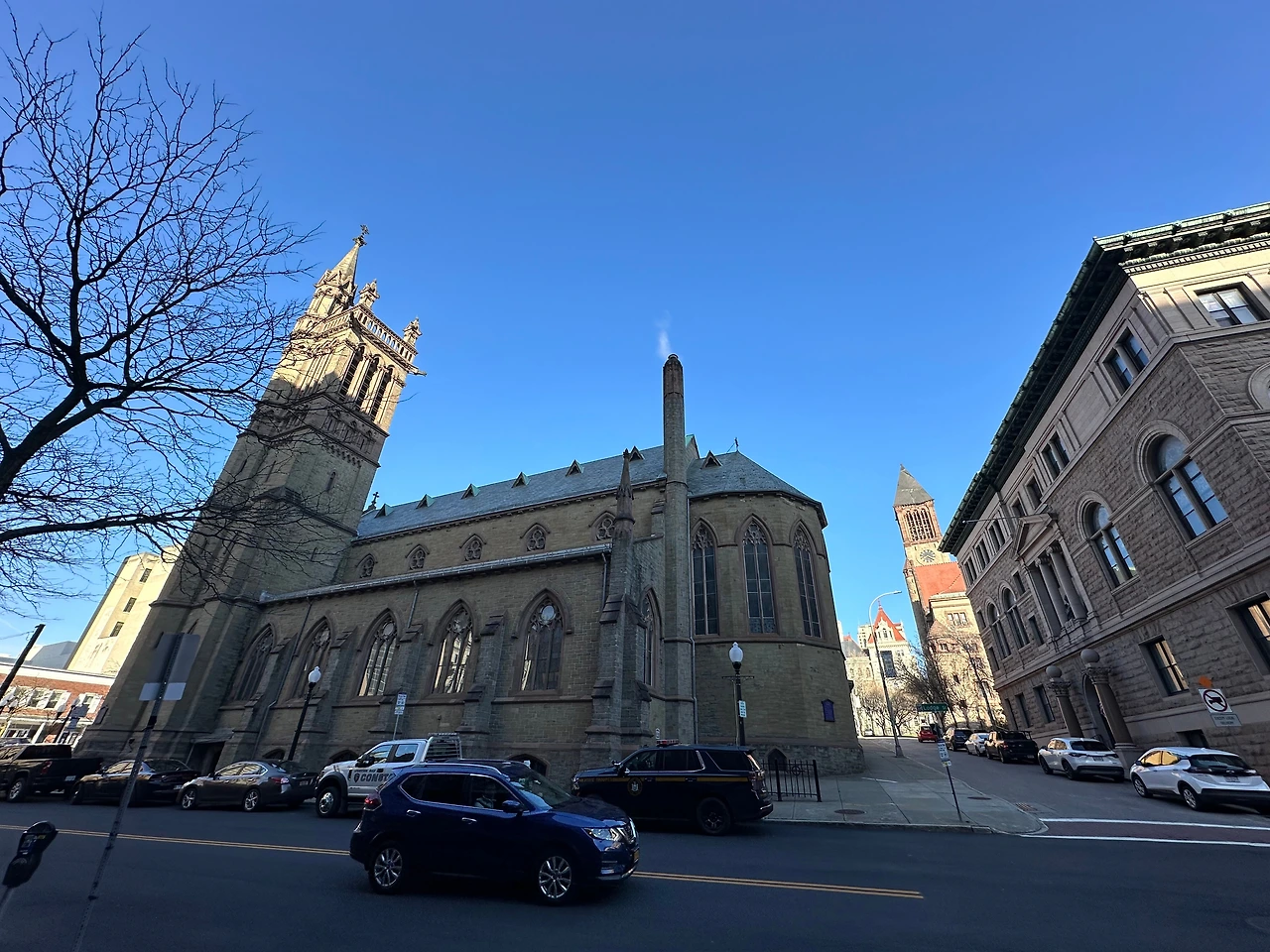 초현대적인 뉴욕시와 달리 알바니는 뭔가 유럽 도시 같이 건물들이 고풍스러웠습니다. 호텔 바로 앞에 시청과 교회가 있는데 둘러볼 시간도 없이 뉴욕시로 출발해야 해서 아쉬웠습니다. 참 미국이 큰 나라이기는 합니다. 주도인 알바니에서 뉴욕시까지 2시간이 넘게 걸리네요. 하긴 뉴욕주의 면적이 남한의 1.4배니까요.