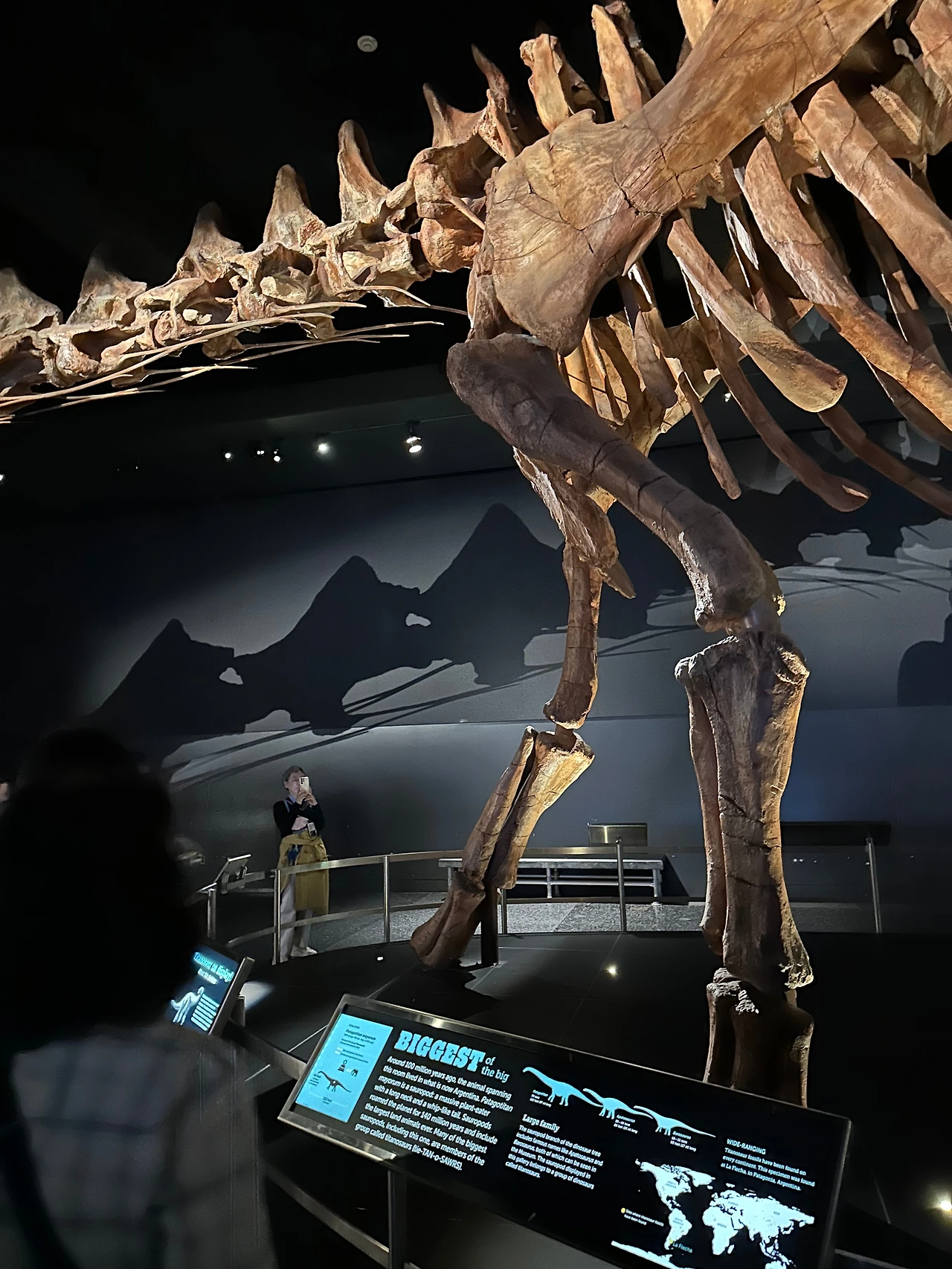 거대한 공룡 화석이 전체적으로 적은 대신 현재까지 발견된 공룡 중 가장 거대한 파타고티탄 마요룸(Patagotitan mayorum)의 화석이 있습니다. 아르헨티나의 파타고니아에서 발견한 화석으로 이정모 관장님 말씀으론 규모 면에서 스미소니언 박물관에 밀린다는 생각을 하다가 이 공룡 화석이 들어오며 자존심을 회복했다네요. 커다란 방 하나가 오롯이 이 공룡 화석에 배정되어 있는데 너무 길이서 머리가 문을 뚫고 나가 있습니다.