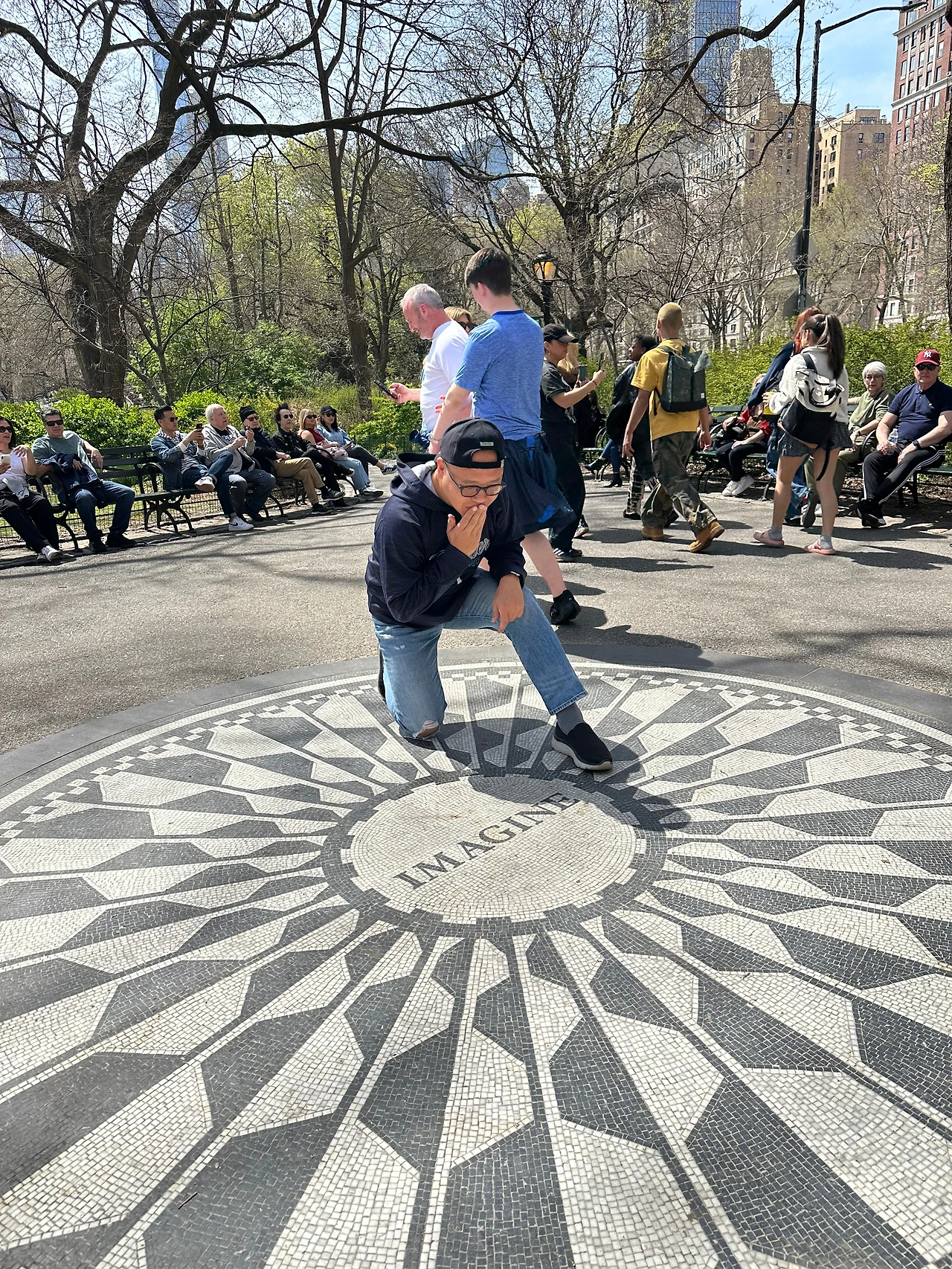 버스에 탑승하기 전 공원을 둘러보는데 바닥에는 Imagine이 새겨진 모자이크 타일이 있어서 모두들 기념사진을 찍고 있었습니다. 그 앞 벤치엔 기타를 치며 비틀즈와 존 레넌의 노래를 하는 분이 계시더군요. 저도 바닥 표식에 애도를 표하고 연주자께도 소량의 찬조를 하고 떠났습니다.
