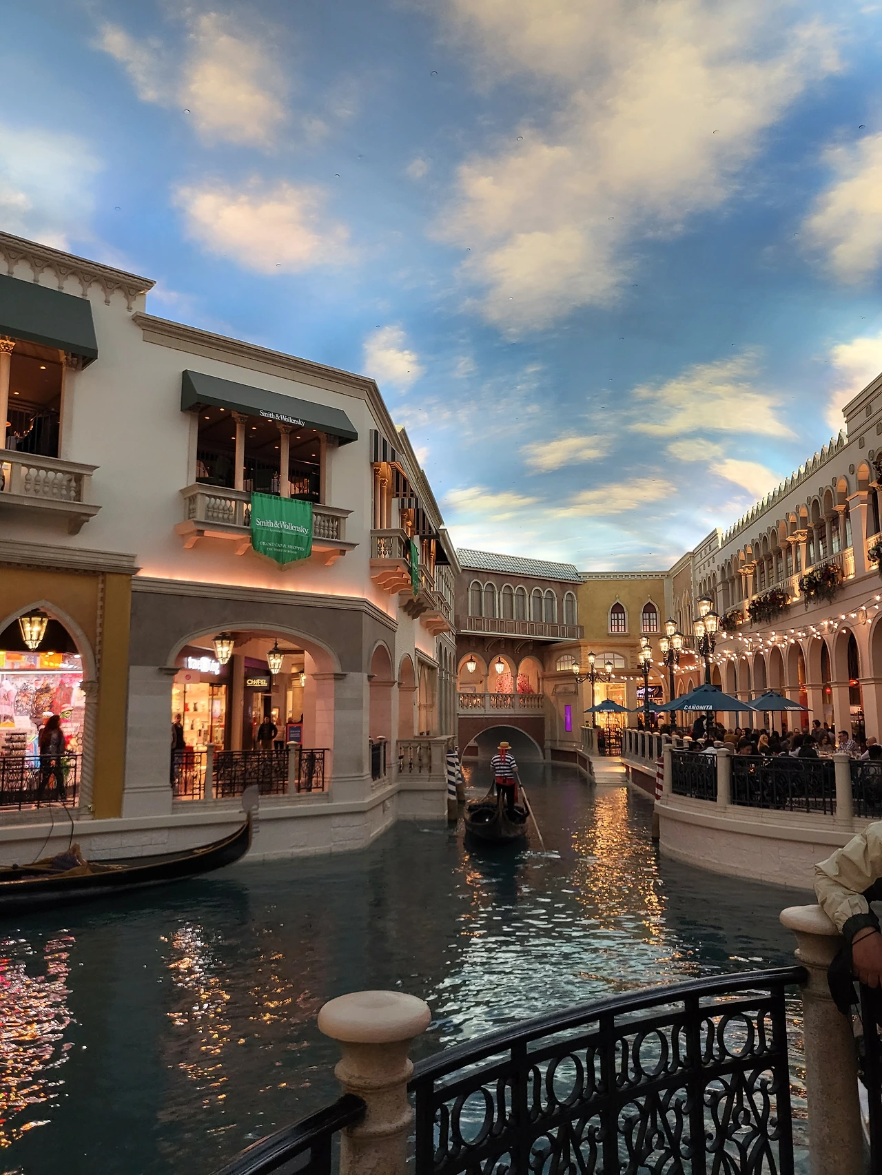 베네치아 호텔 내부의 가짜 하늘과 수로, 수로를 타고 이동하는 배. 인지부조화가 올 것만 같은 장면이다.
