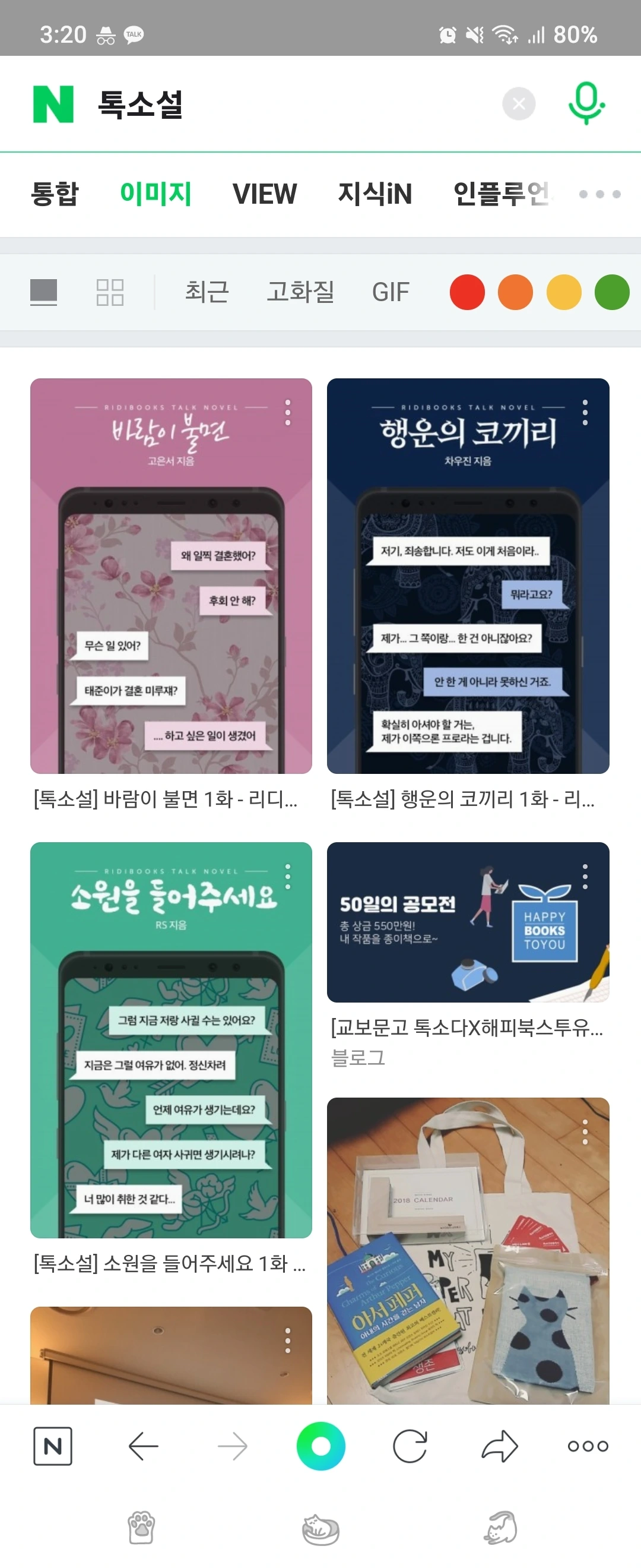 네이버에 톡소설 검색 시 나오는 화면. 검색하면서 처음 알았는데 리디북스에서 위 형태로 연재하여 판매되고 있다고 한다..