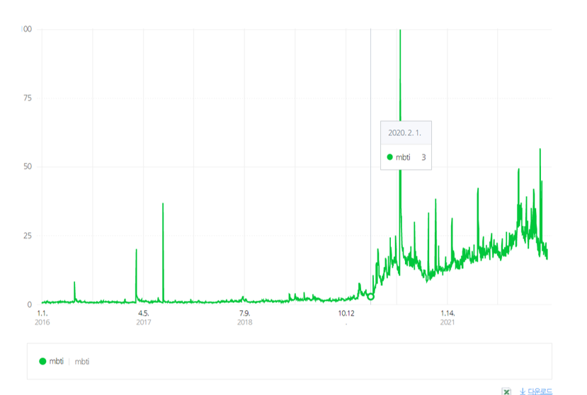 네이버 데이터랩에 따르면 2020년 2월부터 MBTI에 대한 검색량이 폭증했습니다. 2020년 2월은 코로나19의 확산으로 사회가 비대면 체제로 전환되기 시작한 시점입니다.