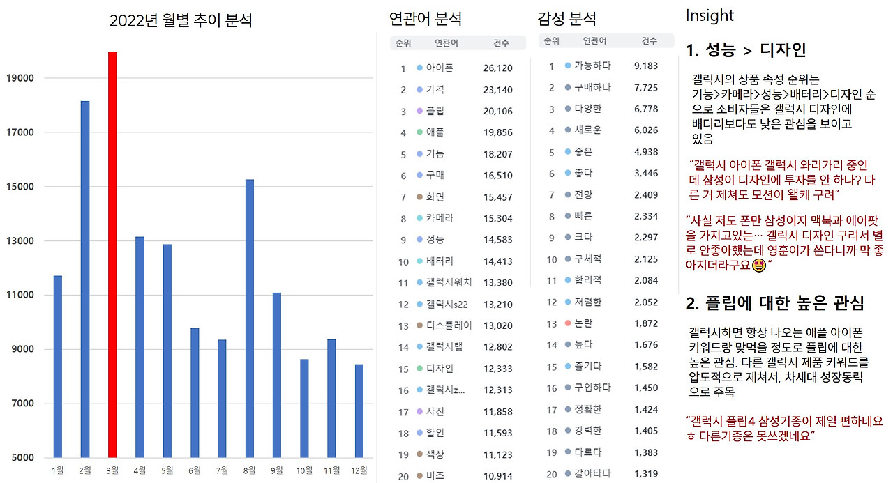 왼쪽부터 추이 분석, 연관어 분석, 감성 분석 그리고 관련 원문까지 들어가 1장으로 확인할 수 있습니다. 그러면 4가지 기능 외에 [성능>디자인], [플립에 대한 높은 관심]으로 적혀 있는 것은 무엇일까요?