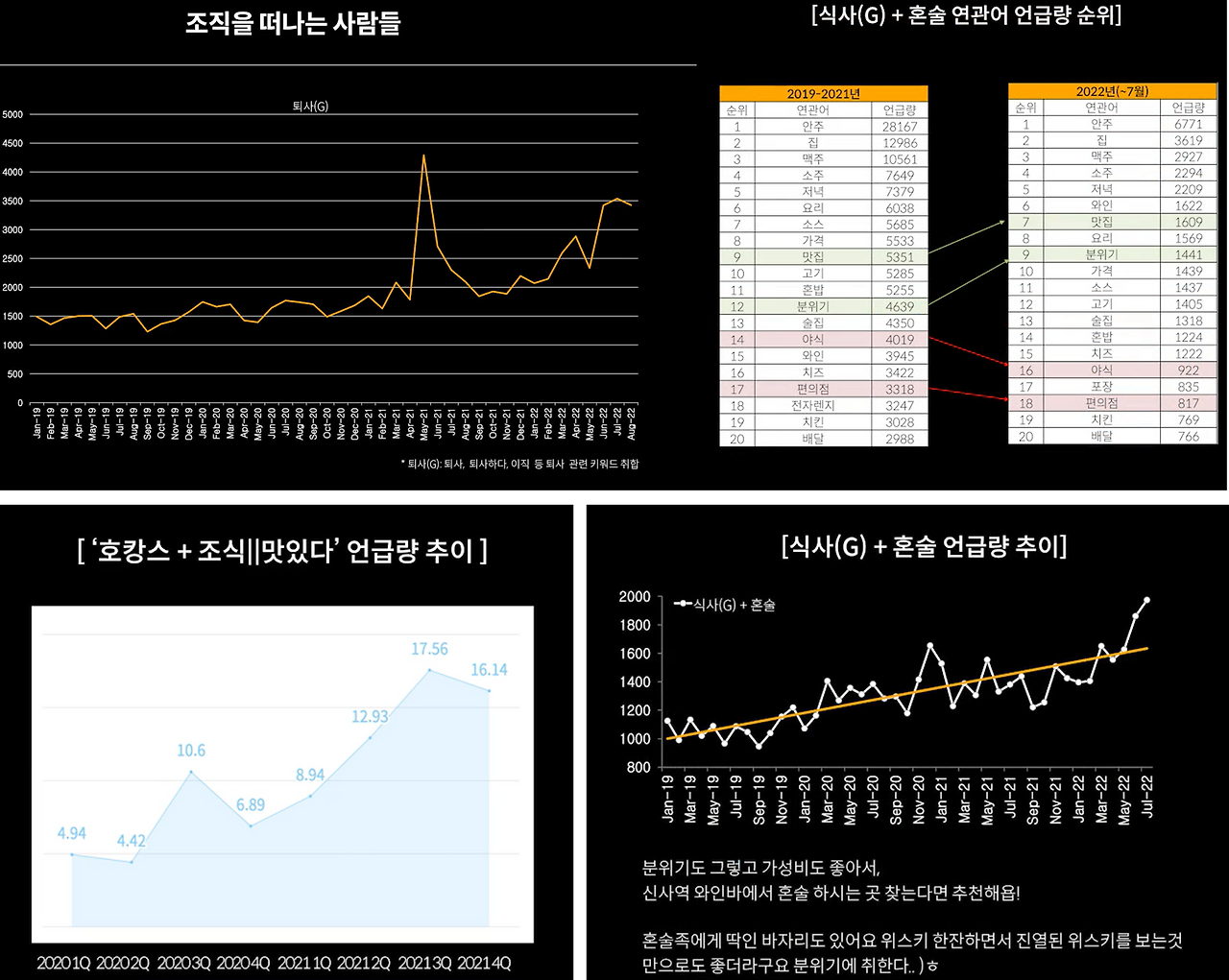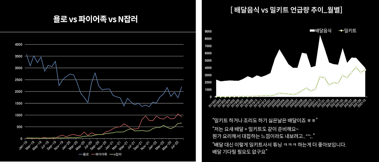 위의 예시를 보면 캠핑 요리 관련 키워드들의 증감을 보며, 시사점을 얻는 것을 확인할 수 있습니다. 동시에 두번째 예시를 보면 취항 연관 주류들을 분류하며, 어떤 주류가 많은 관심을 얻었는지 알 수 있고요.