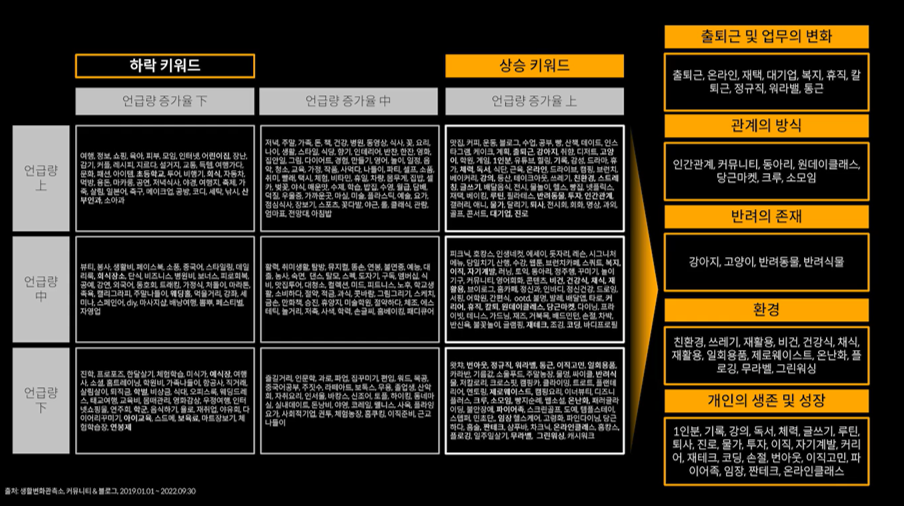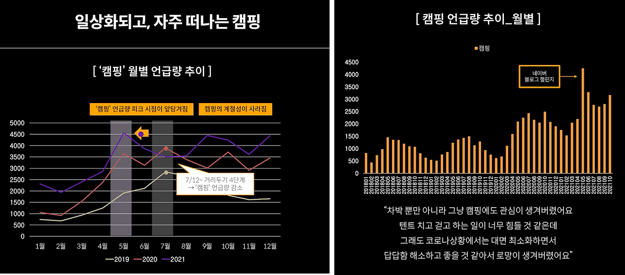 하지만 월별로 분석을 하면 '캠핑 언급량 피크 시점이 변했는지' '캠핑의 계절성이 사라졌는지'까지 알 수 있는 것이죠. 즉, 추이분석 때 시간의 개념도 염두해 놓으면 생각하지 못한 변화를 읽을 수 있는 것입니다.