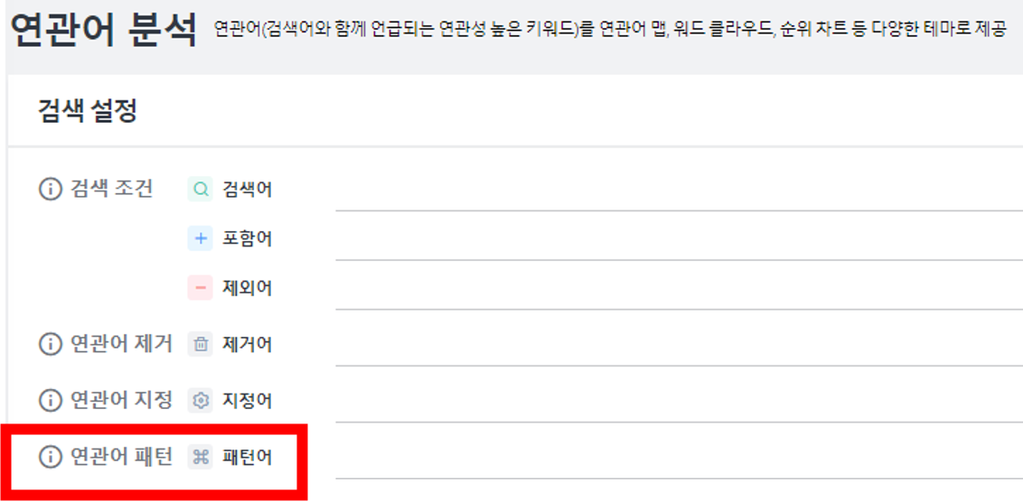 패턴어는 '연관어 분석'에서 활용할 수 있는 기능인데, 인사이트를 얻기 좋은 방법입니다.