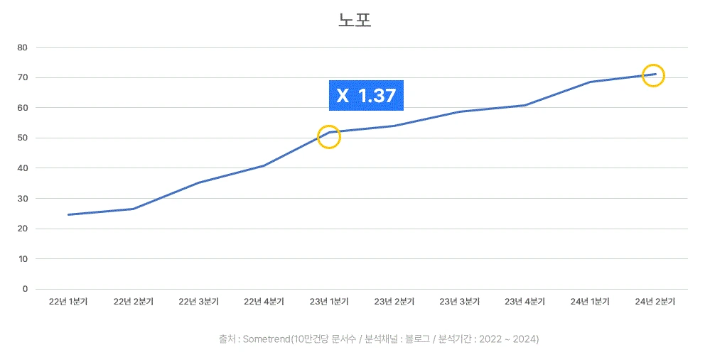 첫번째 키워드는 노포입니다. 2023년 1분기 대비 2024년 약 1.37배 언급량이 증가했습니다.