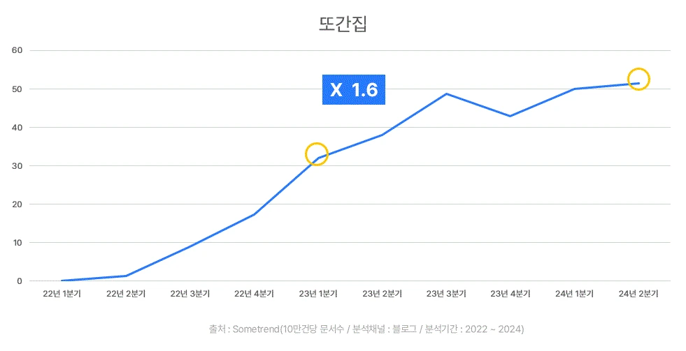 두번째 주목할 키워드는 또간집입니다. 또간집의 뜻은 '맛있어서 또 방문한 집'입니다. 2023년 1분기보다 2024년 2분기에 1.6배 언급량이 증가했습니다.
