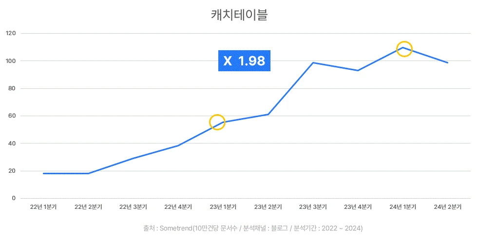 네번째 키워드는 캐치테이블입니다. 2023년 1분기에 비해 2024년 1분기 약 1.98배, 즉 2배 언급량이 증가했습니다.