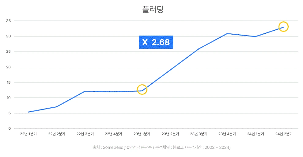 다섯번째 키워드는 플러팅입니다. 2023년 1분기에 비해 2024년 2분기에 무려 2.68배 언급량이 증가했습니다.