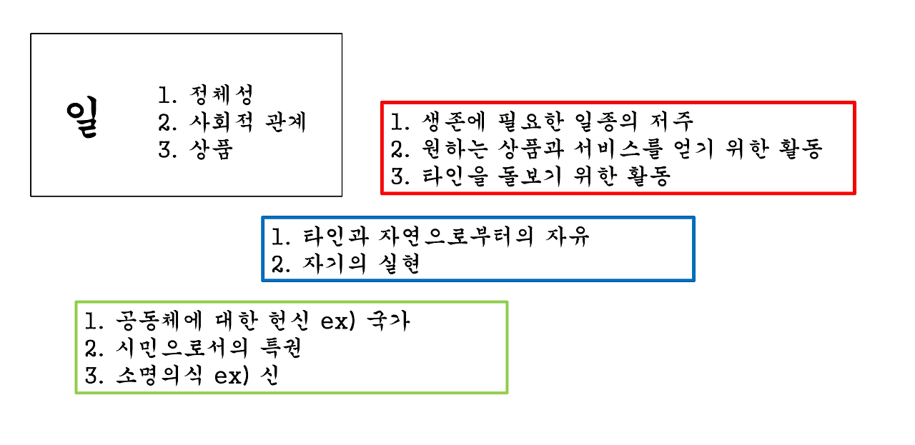 일로 인한 고통을 없애는 것은 구조의 문제라고 해도, 일로 인한 행복을 느끼는 것은 개인의 영역입니다. 이왕 삶을 살아야 하는데 인생의 최소 1/3을 차지하는 ‘일의 시간’을 고통으로 보내는 것은 큰 불행입니다. 다행히도 우리는 그 해답을 과거를 통해 알 수 있습니다. 인간에게서 일은 땔래야 땔 수 없기에, 수많은 사람이 일에 대해 생각해 왔기 때문입니다. 간략하게 정리하면 다음과 같습니다.
