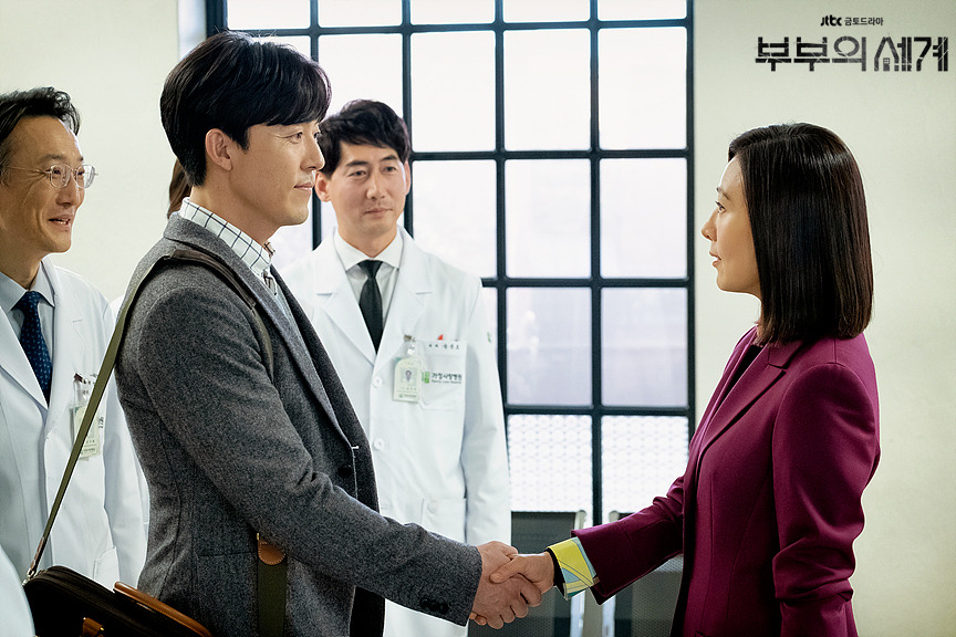 <부부의 세계> 지선우는 초반 조력자가 전무했던 만큼, 추가적인 조력자가 많이 등장한다. 민현서(심은우)가 처음에는 약 처방을 계약 조건으로 삼아 선우를 도왔으나, 선우가 자신을 데이트 폭력으로부터 벗어나게 도와주자 진심으로 돕게 된다. 필자는 한지원과 민현서가 다소 비슷한 포지션이라는 생각이 드는데, 처음에는 다소 적대적인 관계지만 조력 관계로 성장하게 된다는 공통점과 더불어 신선한 마스크와 매력적인 연기를 보여주는 배우가 연기를 하기 때문인 것 같다. 선우의 병원에 새로 온 신경정신과 의사 김윤기(이무생)는 선우의 정신적인 상처를 보살펴주며, 준영과 선우의 관계도 원만하게 해결되도록 돕는 조력자이다. 또한 선우가 양심적인 진단을 함으로써 남편 최 회장의 외도를 알게 된 사모님(서이숙)이 8화부터 조력자로 등장하게 된다.