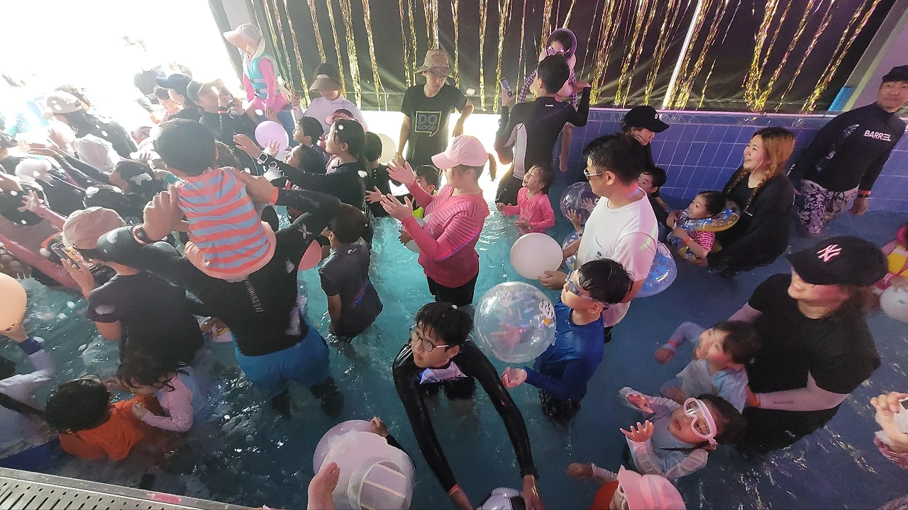 대구시에서 여름에만 한시적으로 운영하는 저렴한 물놀이장이었는데 서둘렀는데도 인파로 미어터졌다. 노랑 병아리 수영복으로 갈아입히고 어른 무릎 깊이의유아용 풀장 안에 들어가 튜브를 태워 물에 둥둥 띄워 놨더니 서영이 입이 귀에 걸렸다.