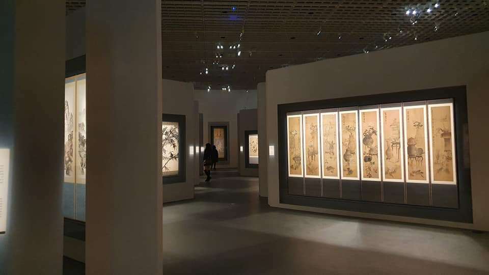 오늘 보니 작품이 다소 높이 걸려있는데 회화처럼 걸려서 눈 앞에 바로 펼쳐지니 작품 세부까지 잘 볼 수 있어 좋았다. 조명, 동선도 상당히 많은 고민이 된 듯 하지만 그보다 더 파격적인 것은 모란도 옆에 김기창의 병풍이 함께 걸려 있어 병풍으로 이어지는 한국화의 전통을 보여주거나 유리장에서 나와 오픈된 공간 속에 놓인 도자기들도 새롭게 보인다는 점이다.