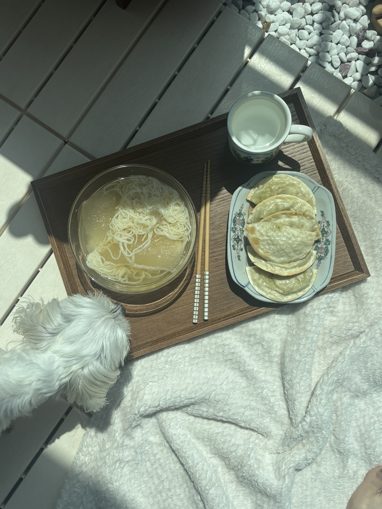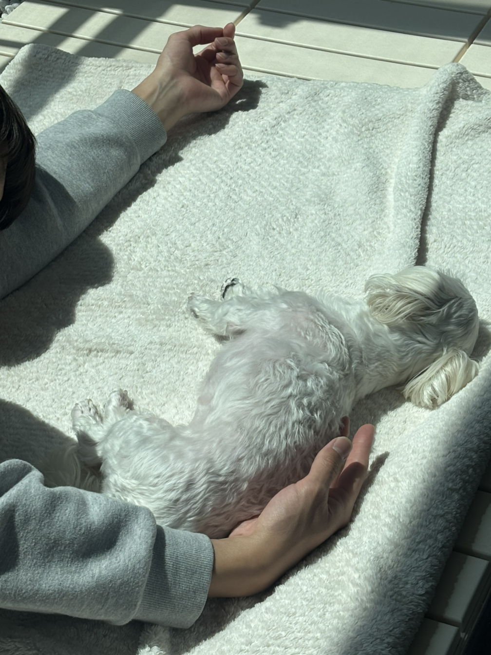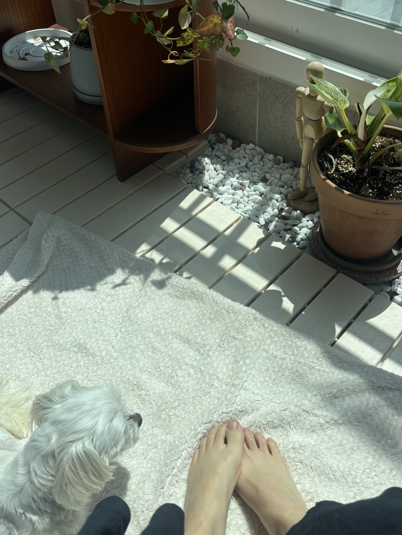 개장은 우리 집 강아지, 우동이가 첫 손님으로 문을 열었다. 베란다의 창문을 열어놓아도 난방기기가 돌아가지 않게 되던 날씨의 날이었다. 오랜만에 미세먼지도 없겠다, 상쾌한 바람을 맞자며 베란다 문을 열어두었더니 바로 나가서 엉덩이를 붙였다. 베란다로 적당히 들어오는 햇빛에 몸을 뉘어서 눈을 가만히 감고 있었다. 그런 모습이 귀여워서 사진을 여러 장 찍고 베란다 문턱에 앉아 바라보았다. 그의 휴식시간을 귀찮게 하고 싶지 않아 옆에 앉아 가만히 지켜보았다. 햇빛을 유난히 좋아하는 우동이는 겨울 내내 거실에 들어오는 햇빛을 발견하고 이른바 '햇빛 구역'에만 누워있었는데 따뜻해지면서 그 햇빛 구역을 찾지 못해 종종 방석 위에서 햇빛을 대신하곤 했다. 그런데 이렇게 베란다의 알차고 꽉 찬 햇빛을 누리고 있는 모습이 행복해 보여서 나도 모르게 뿌듯했다. 누울 수 있게 타일을 깔아놓은 우리가 참 잘했다고 느껴지는 순간이었다.