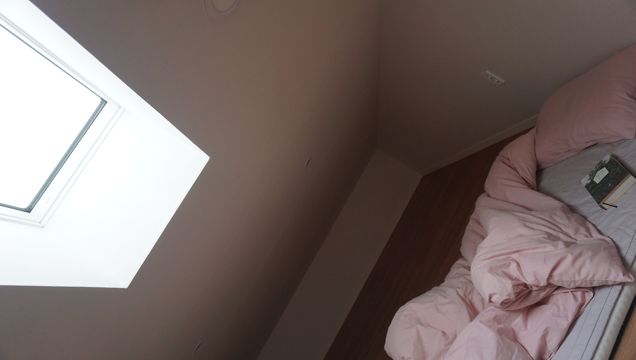 창 곁에는 책상이 놓여있고 심플한 침구가 준비되어 있었다. 이 아늑한 공간의 하이라이트는 하루 종일 구름이 지나가는 것을 넋 놓고 바라볼 수 있을 것 같은 천창이다. 방명록에 따르면 내가 묵기 하루 전에 묵은 게스트가 이곳에서 별똥별을 보기도 했다고!