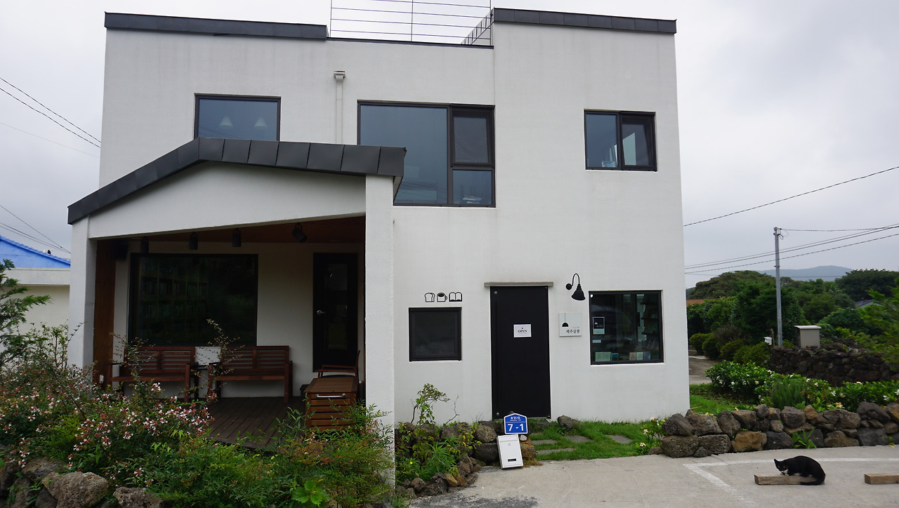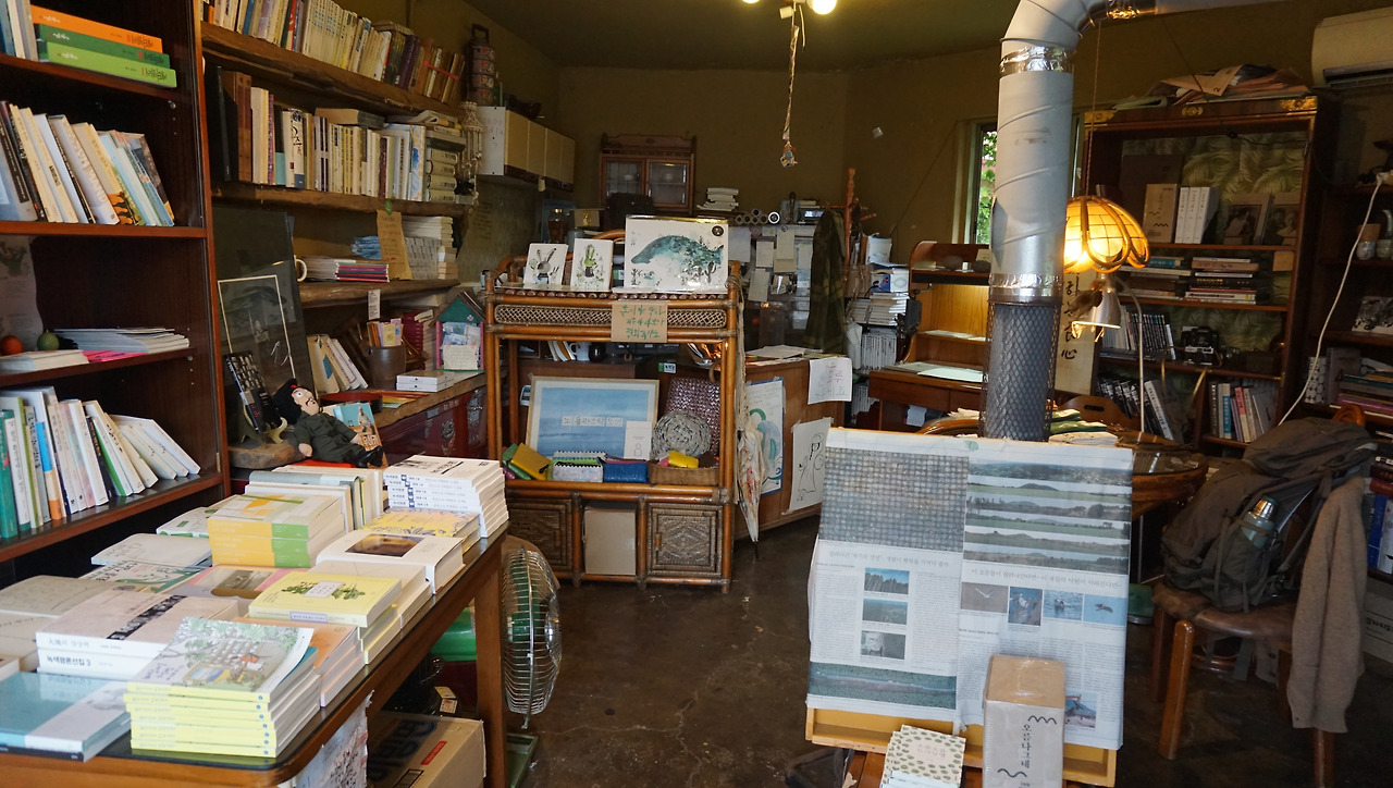 송당리의 매력을 알아챈 게 주인 부부와 나뿐만은 아닌지 마을에는 특색 있는 공간들이 많았다. 그중에 SNS로만 보던 활동가 김키미가 운영하는 '달빛서림'이 있었다. 오래된 난로와 선풍기, 여기저기서 모아 왔을 옛 가구와 나무토막을 괴어 만든 책장 등이 특유의 분위기를 자아내고 있었다. 그리고 그 책장에는 제주도 환경, 생태, 신화, 로컬 문화에 관한 책들이 가득했다.
