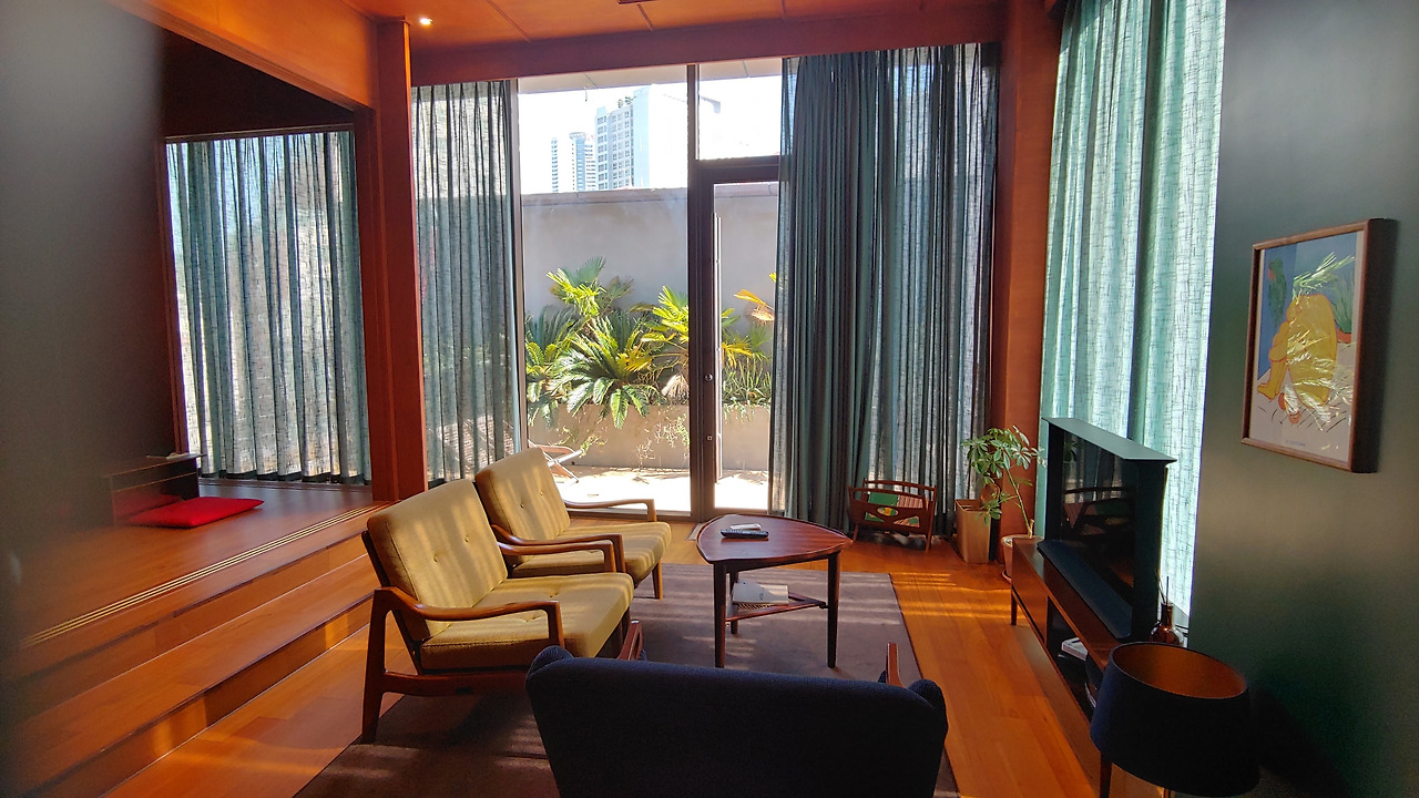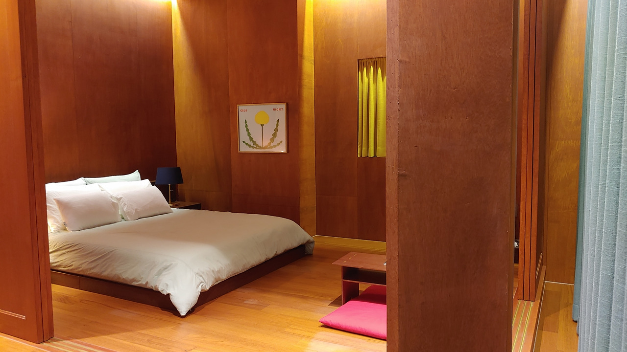 특히 라운지 공간보다 한 단 위에 놓인 침대방이 인상 깊었다. 나무문을 닫아 방으로 만들 수 있었던 것이다. 라운지 공간에 쳐져있는 커튼과 함께 이곳을 현실과 분리해주었다. 바깥 세계는 잊고 환상 속으로 더욱 빠져들 수 있었다.