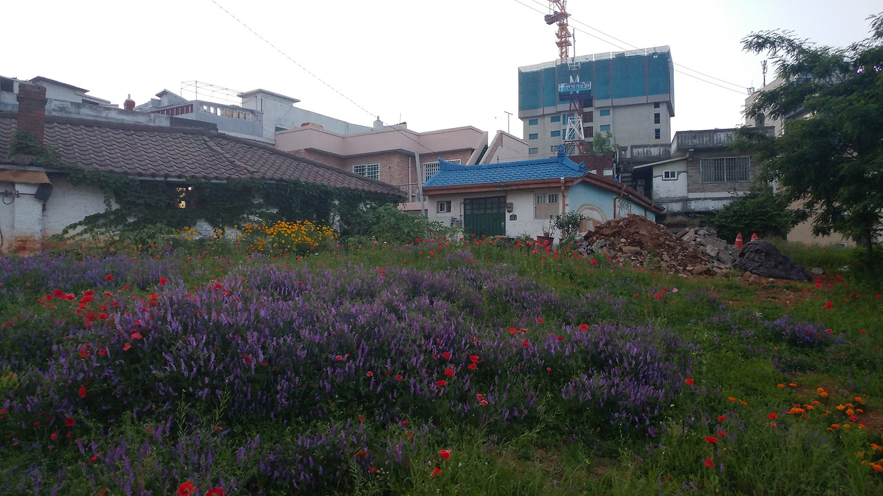 “스페이스 빔” 일대가 배다리 마을로(예전에는 여기까지 배가 닿아 이런 이름이 붙었다) 개항 후 일본인들에게 쫓겨난 조선인들이 정착해 조성한 마을이라고 한다. 조선인 학교, 장터 등을 세워 근대문화를 일군 중요한 곳이지만 최근에는 산업도로로 마을이 두 동강 날 위기에 처했다. 하지만 일본인들에게 쫓겨나서도 마을과 문화를 만들어낸 것처럼, 지금 주민들도 배다리 마을을 지키기 위해 노력하고 있다. 터줏대감인 “아벨서점”을 비롯한 여러 헌책방들과 요일마다 다른 교육 프로그램이 운영되는 “요일가게” 등을 주축으로 마을학교가 열리는가 하면 도로를 위해 철거된 공터에 마을 사람들이 텃밭과 꽃밭을 가꾸고 있는 것이다. 꽃밭에 대한 배경 설명을 듣지 못하고 닿았을 때 나는 이곳이 유토피아로구나, 라는 말이 절로 나왔다. 답사 내내 시간이 멈춘 것 같은 고풍스러운 건물들과 거기서 자생적으로 문화와 예술을 일구어내는 사람들을 보면서 서울에서의 바쁜 일은 모두 잊고 여기 살고 싶다고 생각하던 참이었는데 양귀비와 라벤더 등 이국적이고 아름다운 꽃이 만발한 풍경을 보자 숨이 탁 멎고 만 것이다.