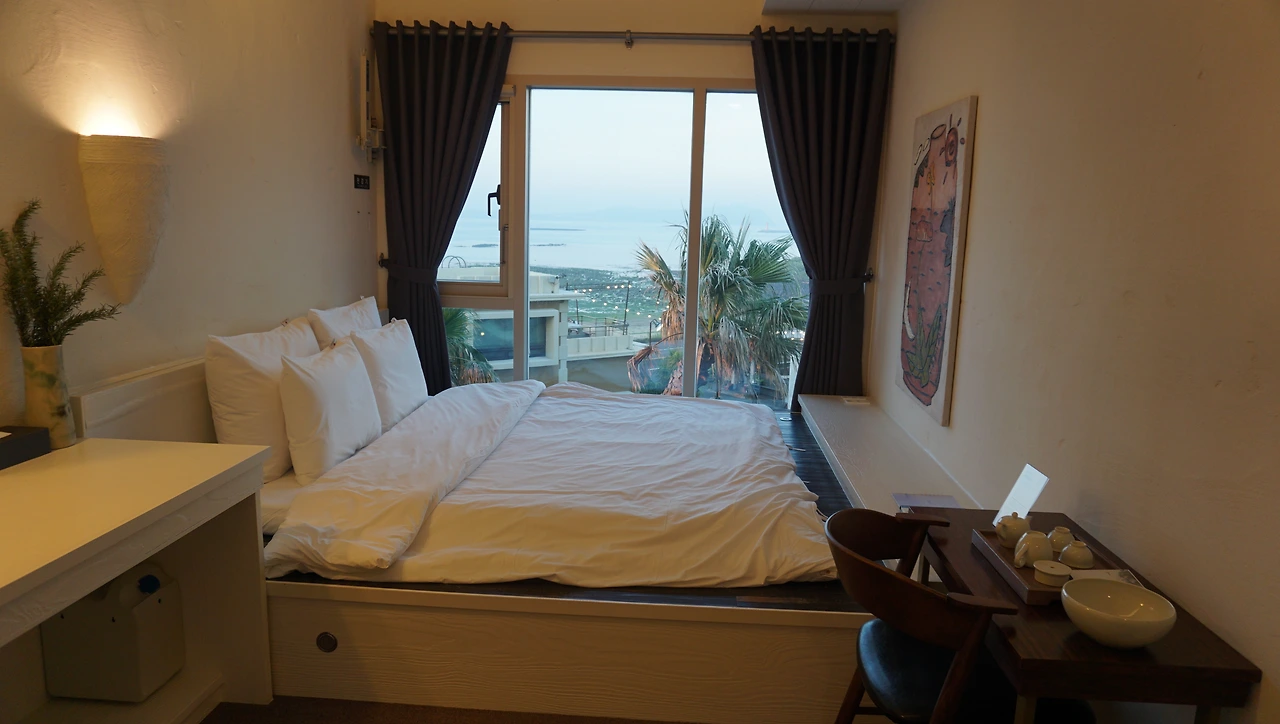 리셉션에서 책과 함께 체크인을 마치고 배정받은 방의 문을 여는 순간 감탄을 금치 못했다. 저 멀리 우도를 품은 바다를 바라보는 넓은 창이 나있고 그 곁에는 창만큼이나 넓은 하얀 침구의 침대가 놓여 있었다. 침대에 풍덩 몸을 던지고 하루 종일 뭉그적거려도 지루하지 않을 것 같이 쾌적한 곳이었다.