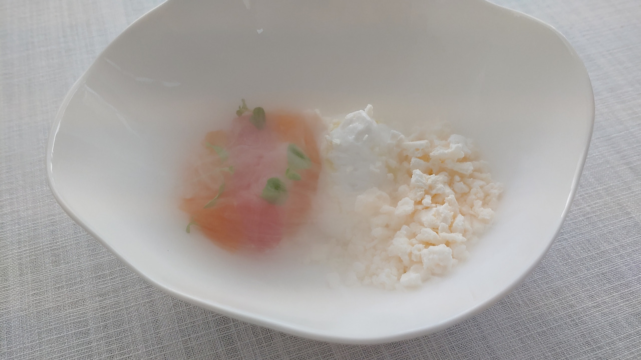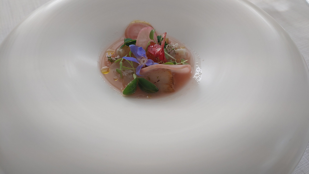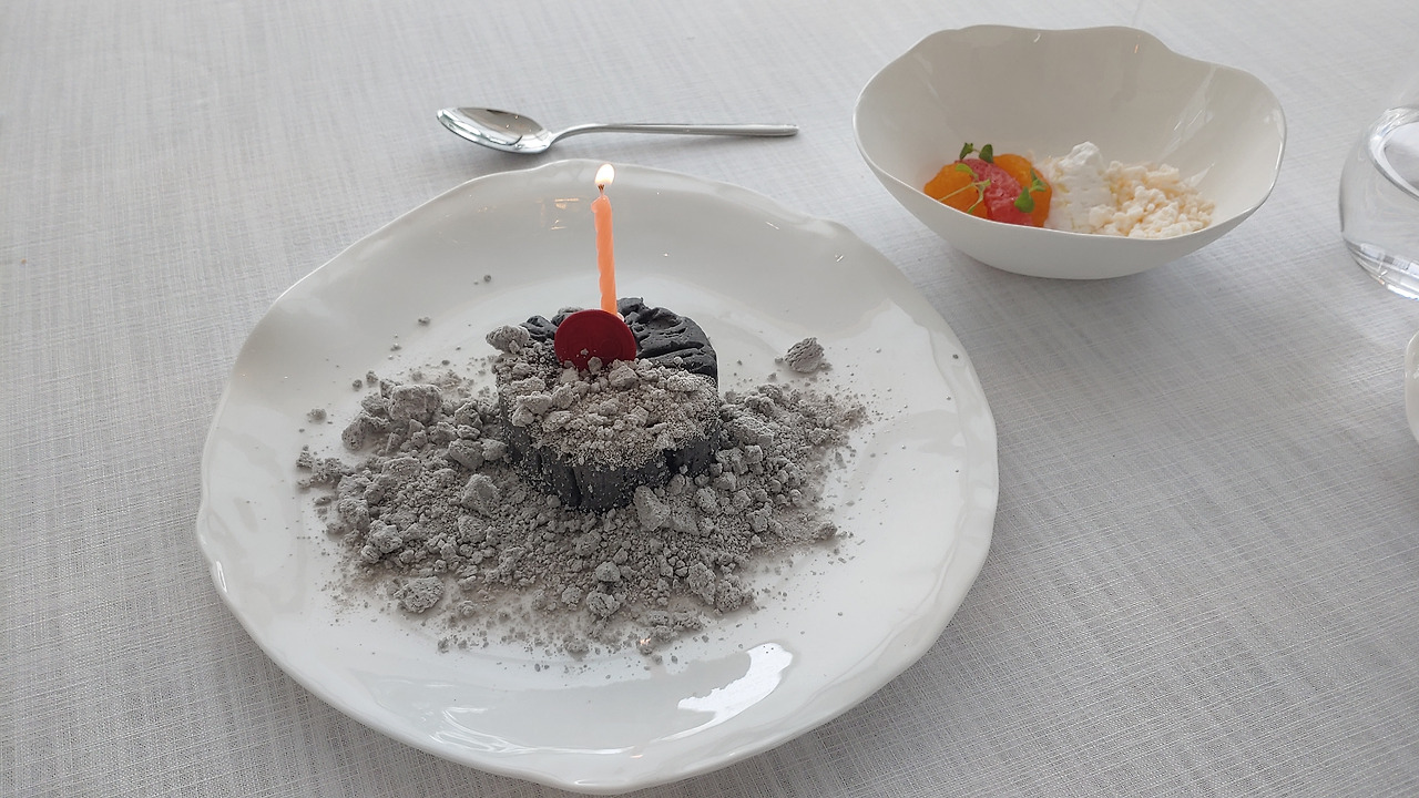 아티피크는 우드 앤 파이어를 컨셉으로 한다더니 그에 딱 맞게 불에 탄 나무=숯을 형상화했다. 사진으로는 잘 안 보이는데 저 재 같은 게 드라이아이스라 멋있는 연출이 만들어졌다. 보기와는 다르게 달달한 초콜릿 케이크로 안에 라즈베리도 숨어 있었다.