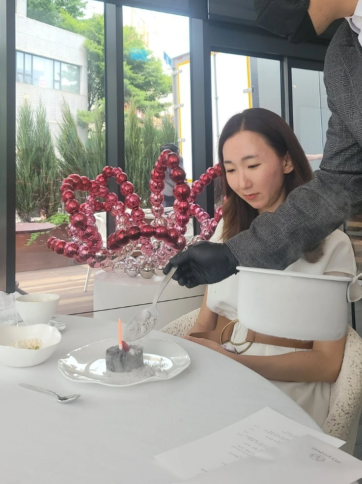 동료들에게는 부끄러워서 내 생일인 걸 밝히지 않았는데 작년에 한 팀이었던 대리님이 기억하고 레스토랑에 전달한 것이다. 레스토랑 측에서는 당일에 말한 거라 따로 준비할 수 있는 게 없다고 하더니(백퍼 수긍!) 원래 저녁 코스에 나오는 케이크를 서비스로 내주었다.