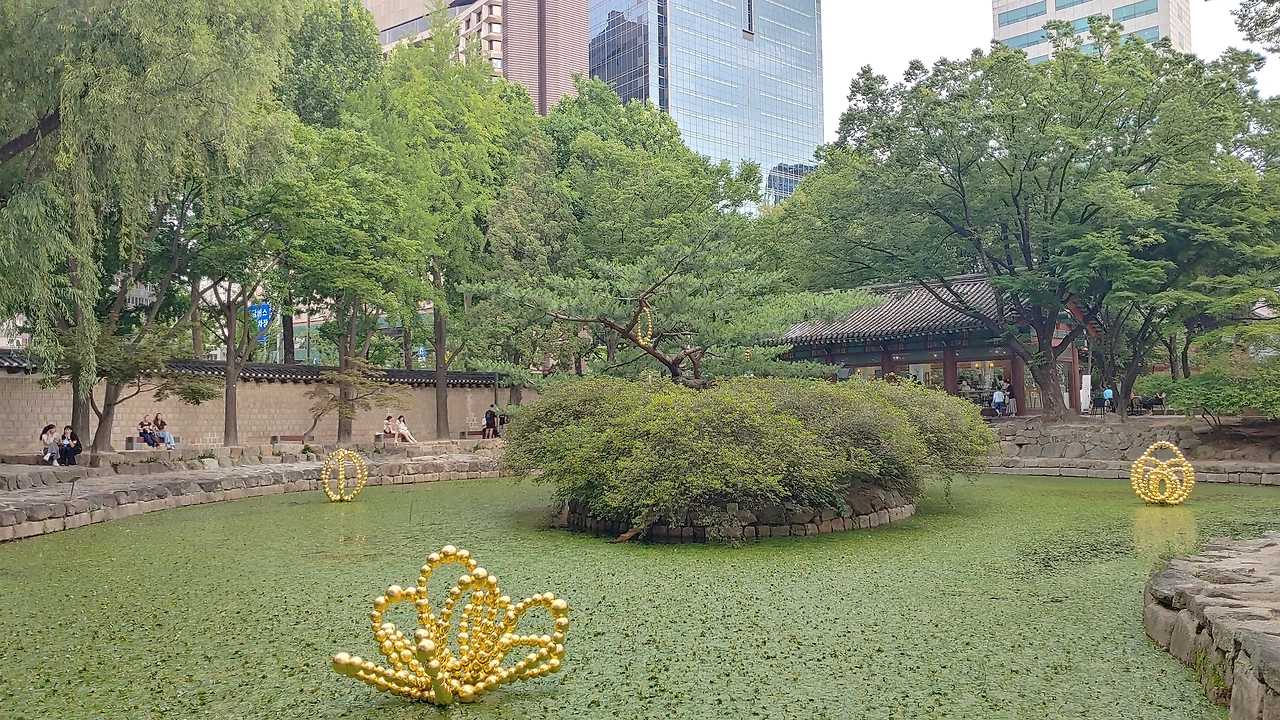 전시는 덕수궁으로도 이어져 연못에 있는 작품들까지 감상했다. <황금 연꽃>이 자연, 한옥 기와와 이질적이면서도 자연스럽게 어우러졌다.