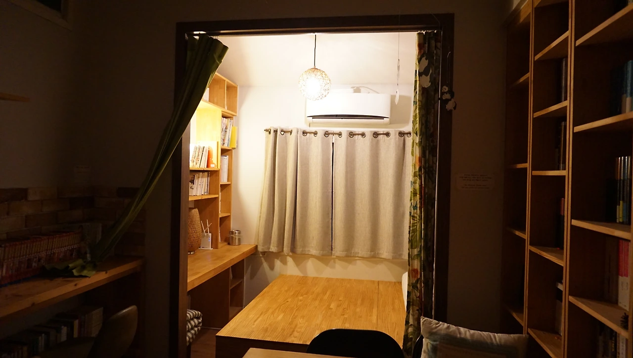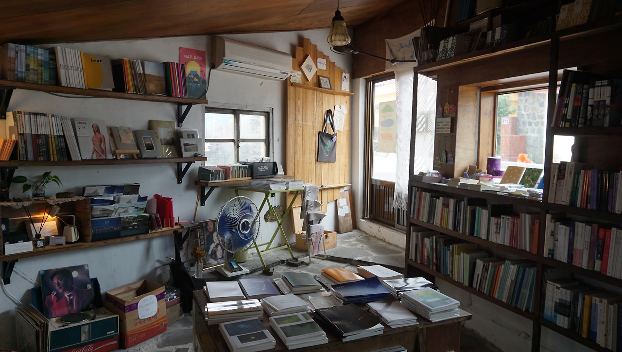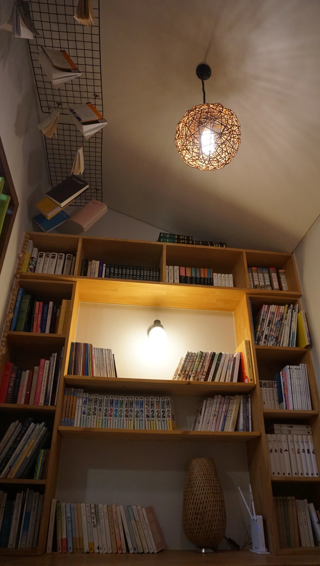 '독채민박 초'는 말 그대로 독채 2채로 이루어져 있었다. 예약을 하면 현관 비밀번호를 가르쳐줘서 호스트와 마주칠 필요 없이 체크인할 수 있는 프라이빗한 공간이었다. 근처에 살고 있는 호스트가 세심한 배려로 미리 모든 걸 준비해놓아 편안했다. 하지만 무엇보다 이 숙소의 가장 특별한 점은 부엌과 침실 외에 책으로 둘러싸인 방이 하나 더 있다는 점이었다. 숙소가 총 2채이니 다른 한 채에도 이만한 양의 책이 있다는 것일 텐데, 규모가 어마어마했다. 찬찬히 살피며 얼굴 본 적 없는 호스트의 취향이나 가치관을 상상해보는 것도 재밌었다. 4인이 앉을 수 있는 탁자와 스탠드 의자로 앉을 수 있는 바 공간이 있어 북카페 하나를 통째로 독차지한 느낌이었다. 거기다 커튼으로 가릴 수 있는 비밀공간이 창쪽으로 하나 더 나 있었다. 하루 종일 숨어서 책을 쌓아놓고 읽고 싶은 곳이었다.
