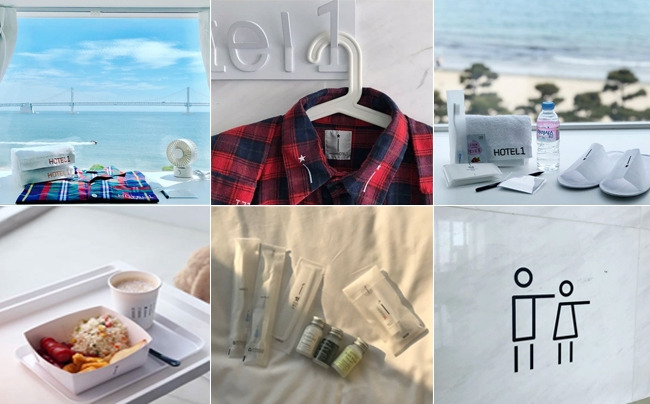 한편 'Hotel 1'의 BI(Brand Identity) 관련 어플리케이션과 오브제들은 고객 연령대 및 취향의 폭을 과감히 좁힌듯한 인상을 줍니다. '집에서 이런 걸 얼마나 입겠어?' 싶게 고급진 목욕가운보단 발랄한 체크무늬 잠옷으로 편안한 휴식을 취할 수 있죠. 또한 취향에 맞게 선택할 수 있는 침대, 호피 무늬 냉장고 바지를 착용한 직원들의 복장, 귀여운 캐릭터가 그려진 패키지의 어메니티, 센스 있는 견과류 선물, 소음까지 신경 쓴 귀마개, 하얗고 자그마한 선풍기 등 하나하나 젊은 층의 취향을 저격하고 있습니다.