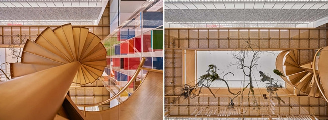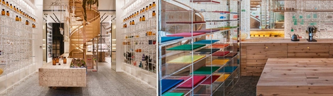 이 곳의 세 가지 핵심 공간은 약사와 고객이 만나는 실험실 테이블, 폐쇄적이지 않은 개방형 제조실, 분자 구조를 형상화한 나선형 구리 계단입니다. 이들은 모두 디자인 그 자체를 위한 분자 메타포의 차용에 그치지 않고, 그 안에서 진행되는 사용자 인터페이스와 개방된 서비스 디자인 전략의 방안으로서 제시되어 그 의미를 더합니다.