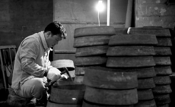 김 대표의 시아버지는 경남 무형문화재 제14호 징장(징을 만드는 장인) 이용구 선생입니다. 새마을 운동이 일어난 후 전통 공예가 사양길에 접어들었지만, 그 고집을 꺾지 않고 꾸준히 전통을 이어온 분이죠. 전승공예대전에서 3회 연속 수상을 하며 실력을 인정받았고, 그때 최우수작으로 뽑힌 방짜 징이 국립국악원에 영구 소장되어 있을 정도입니다. 그리고 그런 아버지의 고집스러운 길을 막내아들이자 김 대표의 남편인 장인 이경동 씨가 이어가며 품질 좋은 징, 불교용품, 카페 '놋그릇 가지런히', 브랜드 '놋이' 등을 탄생시킨 것입니다.