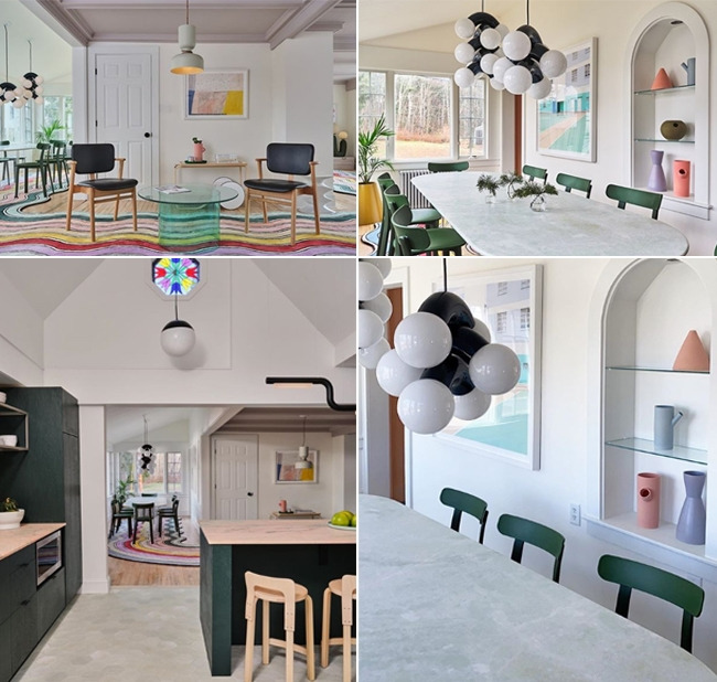 '언 에스테틱 퍼슈트'가 만든 이 집 ‘Pieces Homes Kennebunk(피시스 홈스 커네벙크포트)’에는 파도가 물결치듯 입체적인 컬러와 디자인으로 온 거실을 감싸 흐르는 유선형의 카펫, '알바 알도'의 목재 다이닝 의자, '제스퍼 모리슨'의 모듈식 소파, 'Vitra'의 의자 및 가구들, 뉴욕 첼시 아티스트들의 그림을 판매하는 온라인 아트숍 'Uprise(업라이즈)'의 그림 등이 그 주인공들입니다.