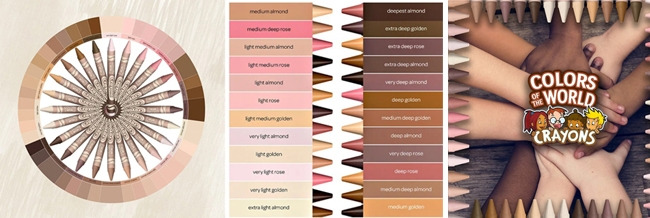 크레용 브랜드 'Crayola'는 최근, 전 세계 40가지 이상의 피부 톤을 정리하여 총 24가지 색의 스킨 톤 크레용을 개발했습니다. 우리가 흔히 아는 '살색'을, 어릴 적 크레파스나 물감 세트에 언제나 딱 한자리를 차지했던 바로 그 '살색'을 24가지로 재정의 내린 것입니다.