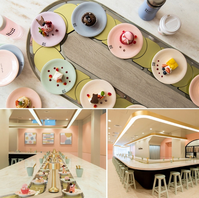 이곳의 좌석은 공간 중간에 원 테이블로 마련되어 있는데, 이것이 바로 회전 초밥에서 힌트를 얻어 제작된 '디저트 회전 레일'입니다. 즉, 특별한 디스플레이 자체가 비주얼에서부터 다른 요소로까지 작용되고, 그러한 차별점은 시각적으로 예민한 타깃 세대들에게 정확히 어필된 것입니다.
