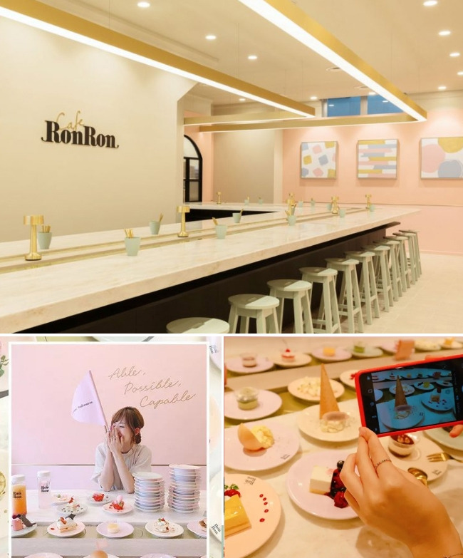 사진과 영상으로 담았을 때 그동안 보지 못한 특별한 경험으로 보일 이곳의 비주얼은 지극히 타깃 중심적인 핑크 위주의 인테리어와 함께 '인스타바에(インスタ映え/인스타그램에 올렸을 때 더욱 빛을 발하는)' 요소로 적합하기 때문입니다. 그들에게 디저트란, 그저 배를 채우기 위한 아이템이 아니라 순간의 분위기와 기분까지 모두를 '경험'으로 만들어주는 것이기 때문입니다. 게다가 이러한 경험은 타인들과 '공유'될 때 진정 그 빛을 발하는 것이기에, 회전 레일과 같은 방식과 인테리어는 다섯 시간의 대기까지 가능하게 하는 것입니다.