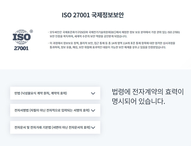그리고 이 모든 것들보다 중요한 법적 효력의 측면을 살펴보면, 기존의 종이 계약서와 같은 효력을 가져 오히려 정부에서 전자계약을 권장할 정도입니다. 여기에, 체계적인 보안 시스템으로 외부로 유출되어서는 안 될 계약 내용과 서명을 가장 신경 쓰는 인상을 받습니다.