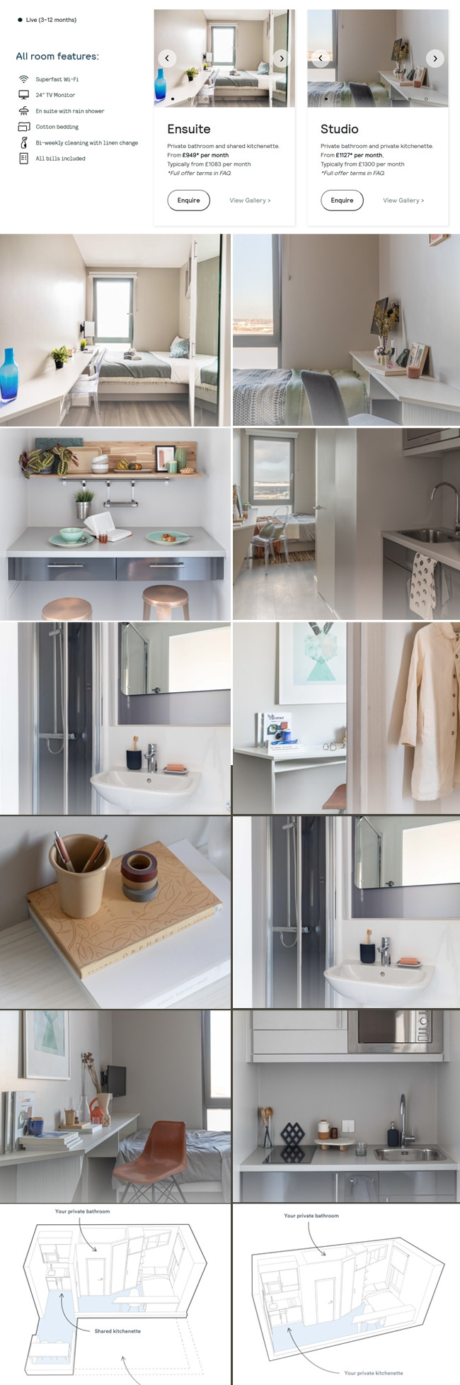 이곳의 룸은 Ensuite와 Studio 두 가지 형태로 나뉩니다. 각각 크기와 구조, 가격 면에서 차이가 있지만 방 안에 개별 욕실과 작은 싱크 시설까지 되어있어 이 두 곳을 반드시 공유해야 한다는 부담감도 덜 수 있습니다. 특히 욕실과 같은 경우 굉장히 프라이빗한 공간으로서, 아쉬움으로 남을 수 있는 예민한 부분이니 말입니다.