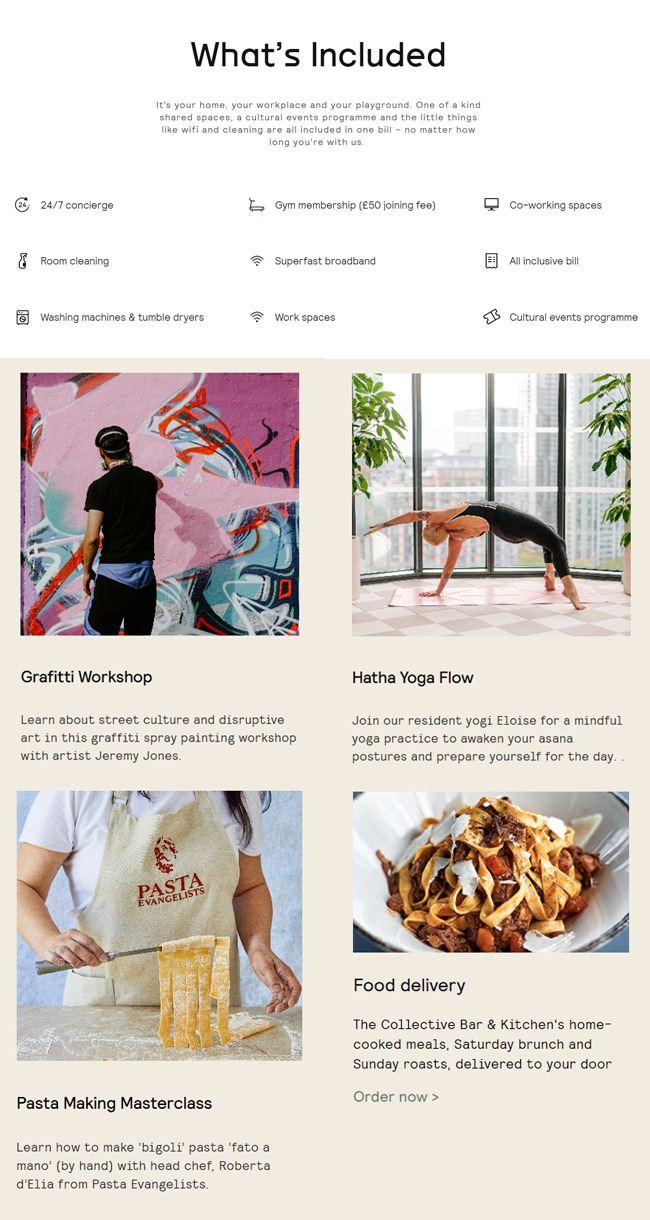전기, 수도 요금, 와이파이, 경비, 방 청소 및 침대보 교체 서비스가 모두 포함되어 있는 것은 물론, 주택 안의 모든 시설, 즉 세련되고 모던한 갤러리, 도서관, 식당, 극장, 세탁실, 게임방, 체육관, 커뮤니티 라운지, 루프톱 정원 등과 브런치 딜리버리 서비스, 요가, 워크숍 등의 이벤트 프로그램들을 모두 누릴 수 있는 권리가 포함되어 있는 것입니다. 월세 이외에 추가로 매달 들어가는 부가 금액들이 대거 포함된 것은 물론, 스스로 시간과 노력을 들여 해결해야 할 청소와 같은 일들까지 해결이 되니 결과적으로 그리 비싼 가격은 아닌 것이 되지요. 그것도 런던의 물가를 생각했을 때는 더욱.