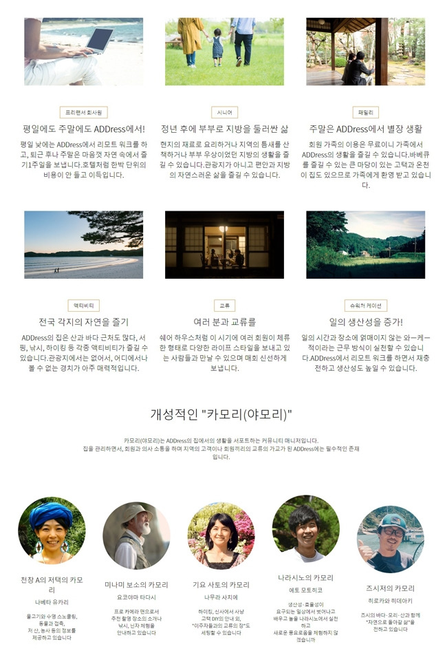 셋째, ADDress는 생활을 서포트하는 커뮤니티 매니저 ‘야모리’ 시스템을 운영 중입니다. 매우 다양한 경험과 개성을 가진 그들은 집 관리는 물론 회원과 의사소통, 지역 고객이나 회원 간의 교류를 위한 가교 역할의 필수적인 존재입니다. 즉, 고객들을 공간만 제공받는 것이 아니라 ‘야모리’를 통해 그곳에서의 생활까지 도움을 받습니다.